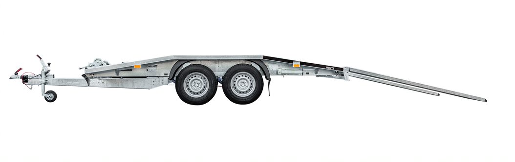 Autotransporter Hochlader  mit gebogener Ladefläche, mit Standschienen, Auffahrrampen und Winde. Geschweißter und robuster Konstruktion. Niedrige Ladekante für einen geringeren Auffahrwinkel. Stahl-Teleskoplippe zwischen den Lohrs.