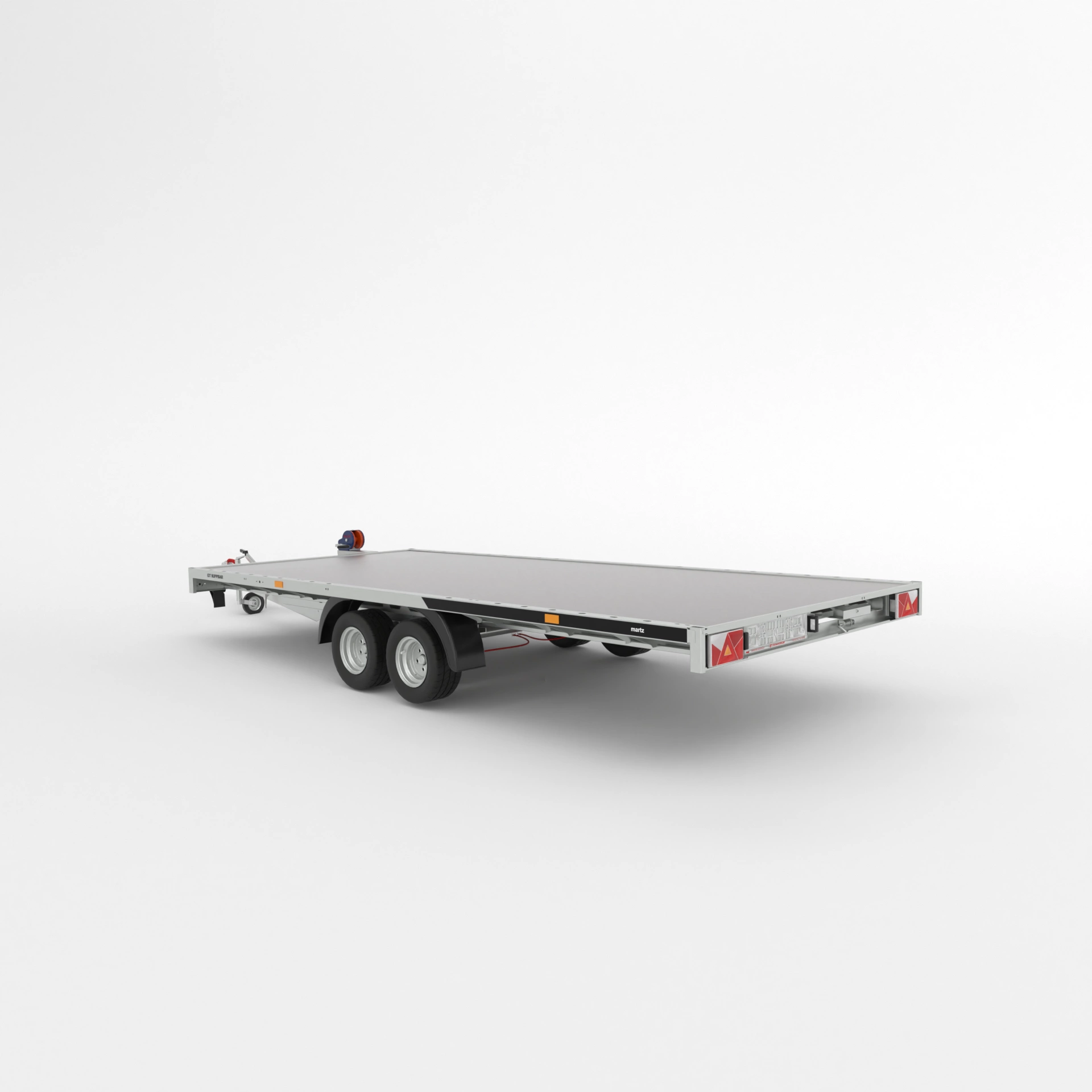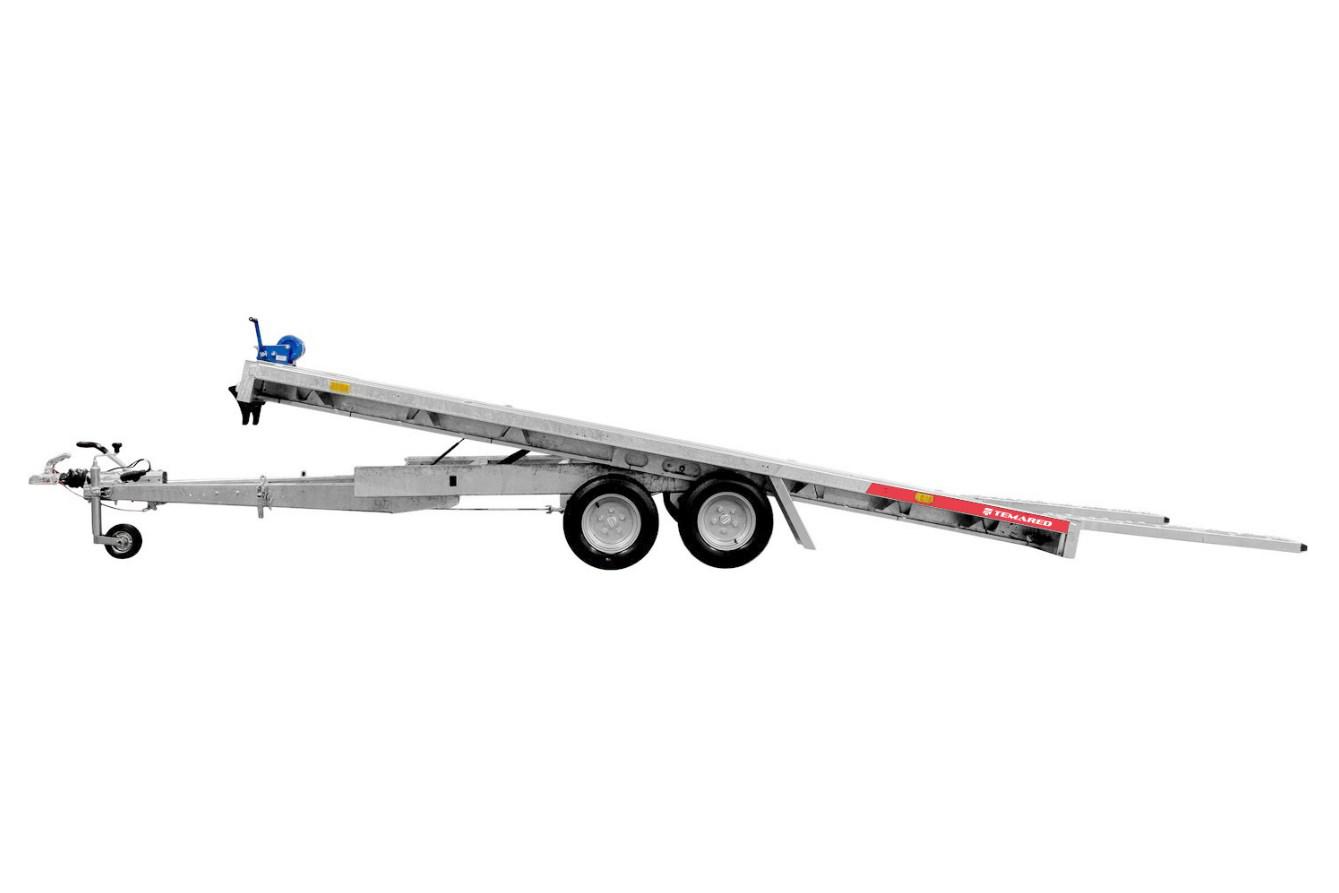 Autotransportanhänger mit Kippfunktion der Transportfläche. Der niedrige Winkel (6 Grad) erleichtert das Beladen von Fahrzeugen mit niedriger Federung. Rampen 1500 mm lang, einfahrbar unter der Transportfläche. Unterlegkeile aus Stahl. Lieferbar mit Vollsperrholzboden oder Blechboden auf Sperrholz. Kann mit Aluminiumwänden sowie einem Rahmen mit Plane ausgestattet werden.