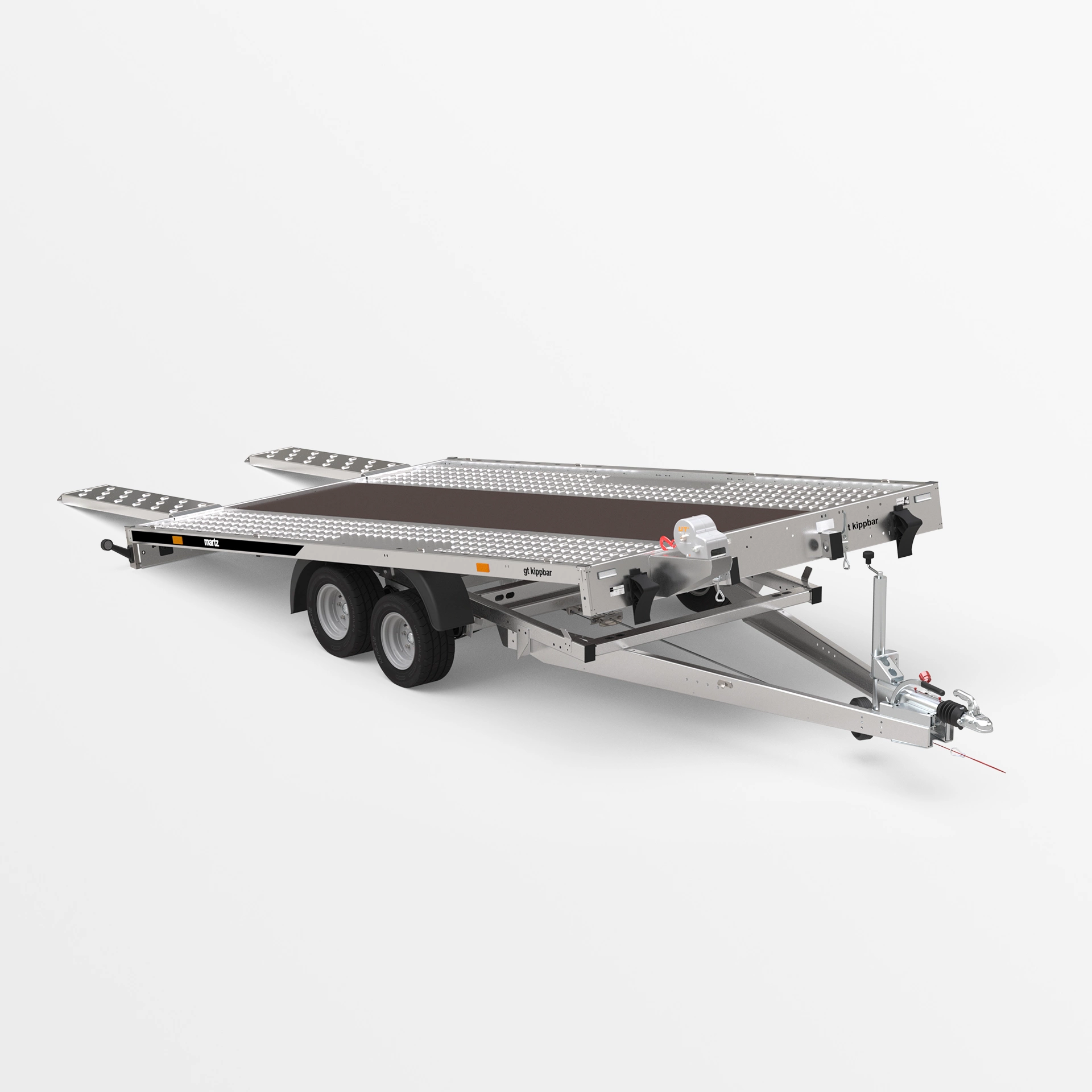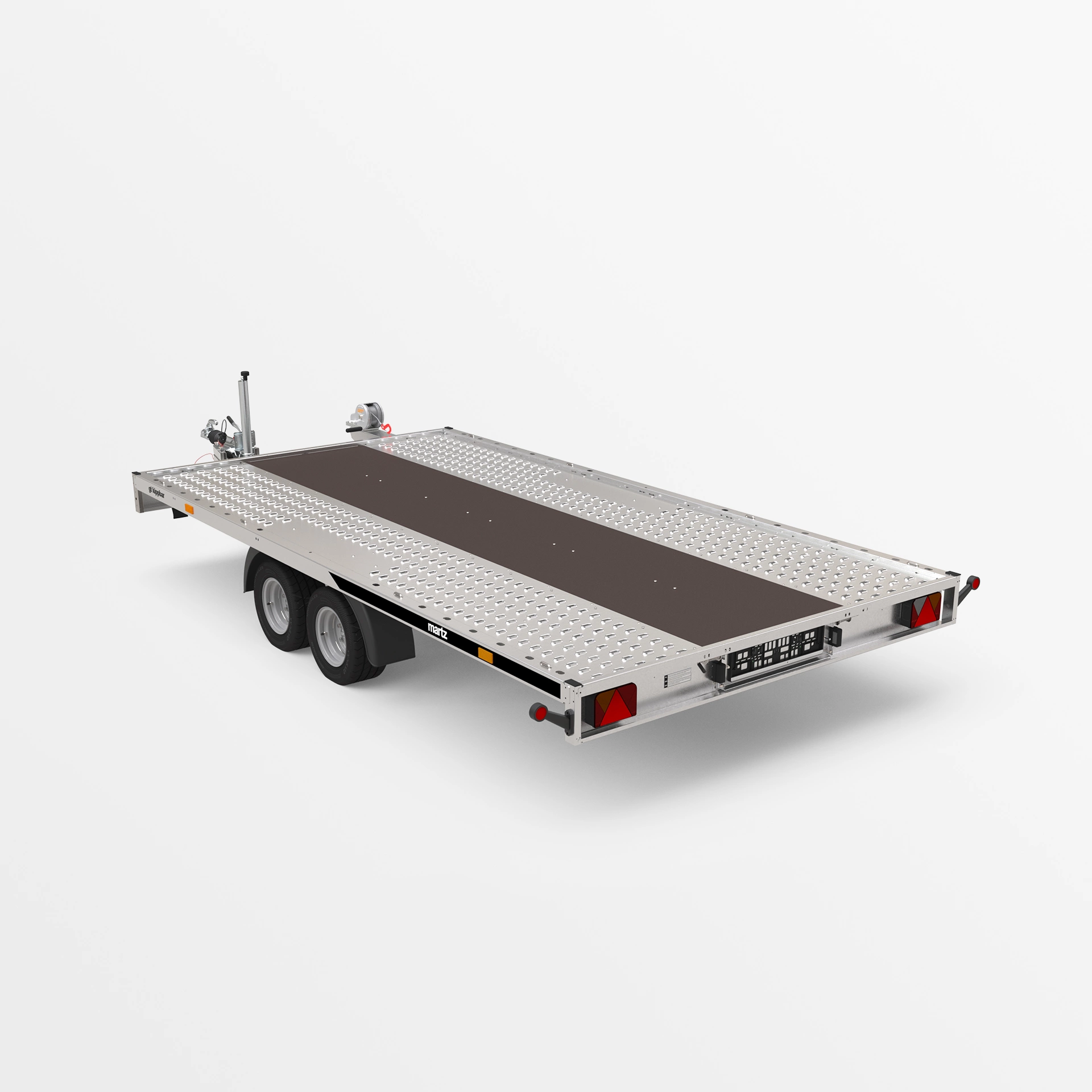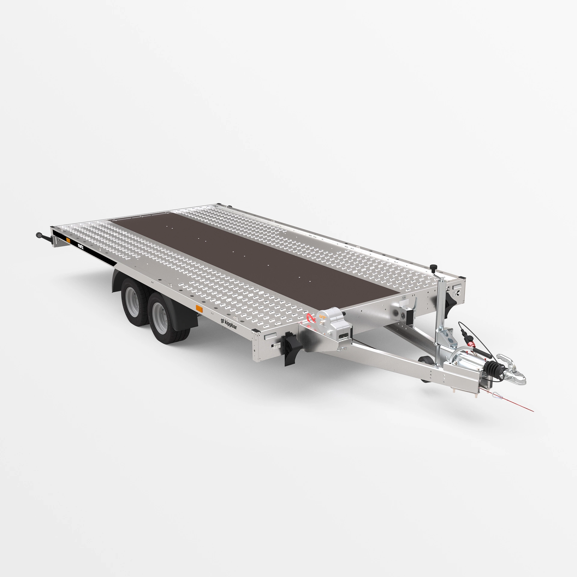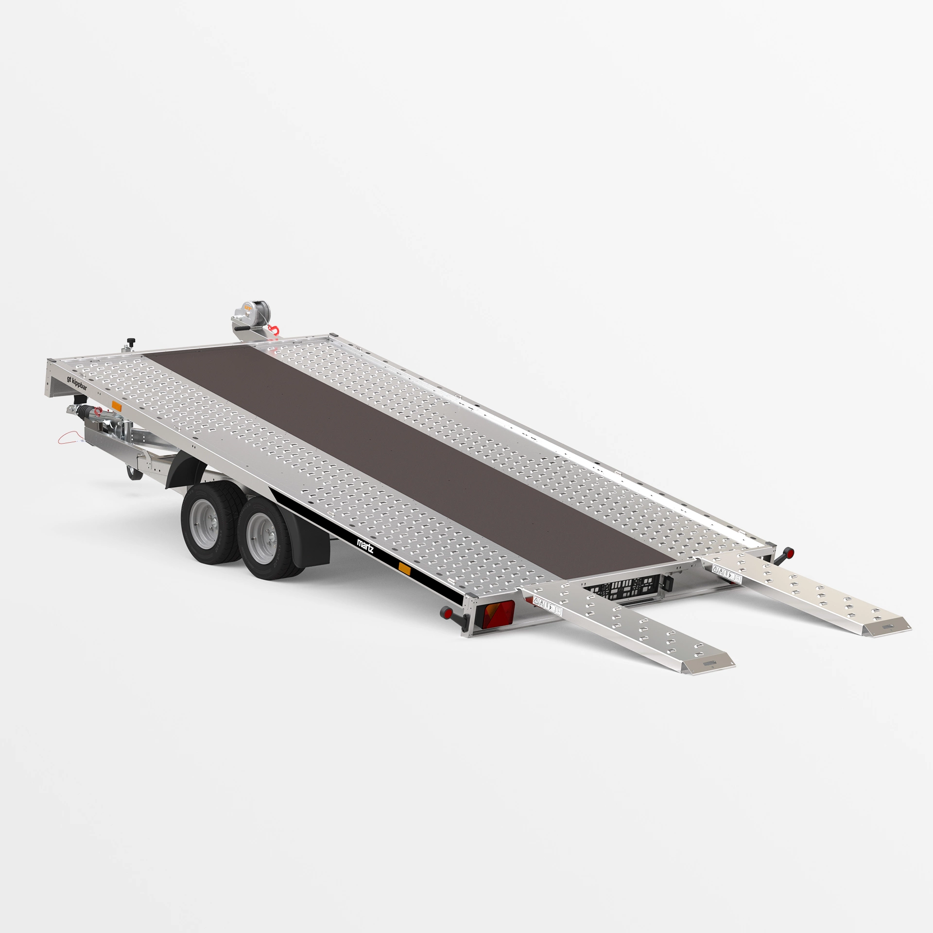 Universal geschweißte Pritsche für den Transport von Autos. Schienen unter der Transportfläche versenkbar In den Längsträgern Halterungen zur Befestigung von Transportgurten. Kann mit Aluminiumbordwänden sowie einem Gestell mit Abdeckung ausgestattet werden.  Standschienen  Stahl,  mittig Siebdruck beschichtete Sperrholzplatte.