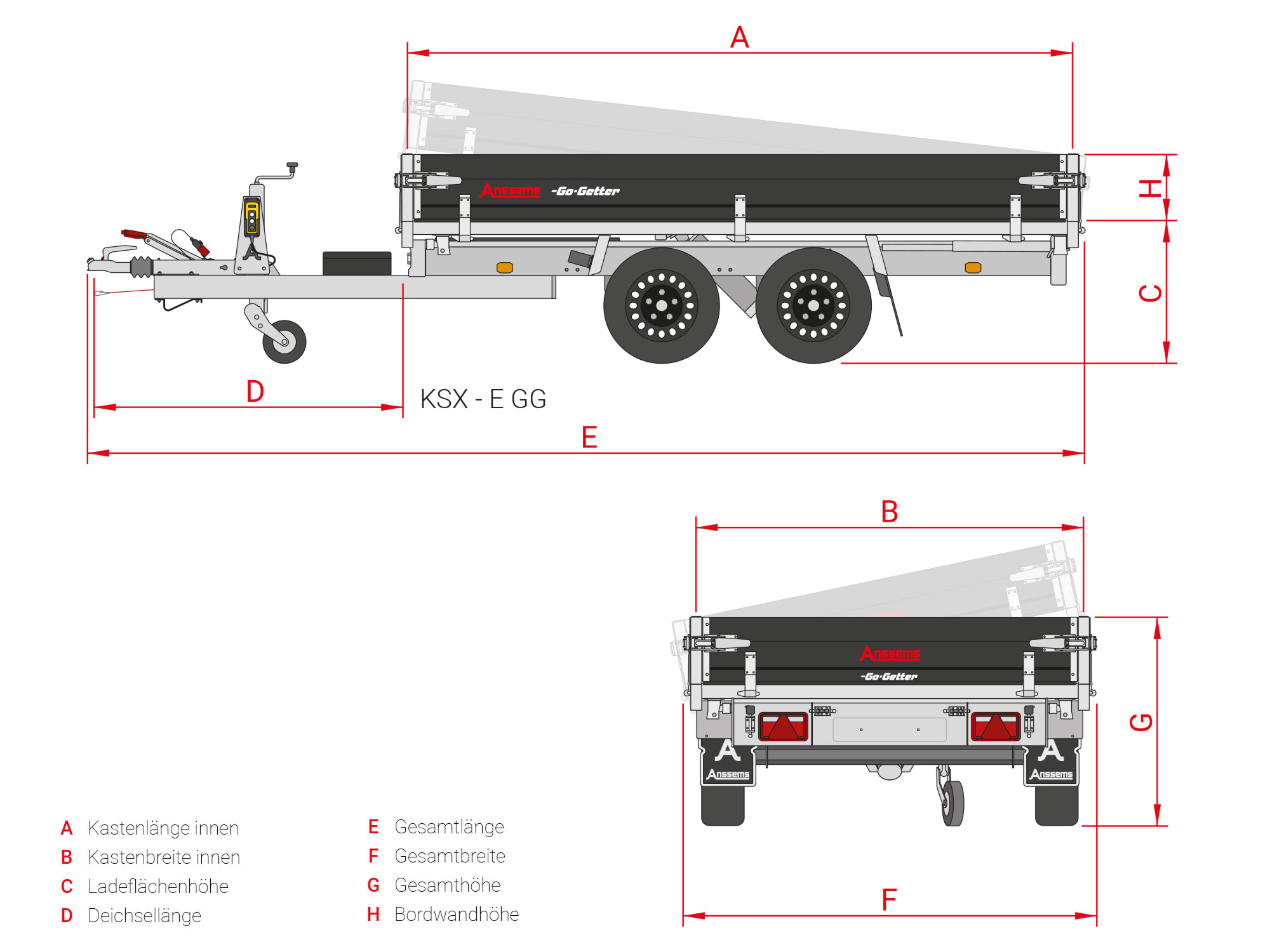 Weiterhin verfügt der KSX Go-Getter über einen stabilen, verschweißten Rahmen, serienmäßig ausgestattet mit 30 cm hohen Alubordwänden mit Spannverschlüssen, gut gestütztem Stahlboden, 4 Bindehaken im Kasten (8 Stück, 4 je Seite) , Seitenbeleuchtung und Automatikstützrad. Zum einfachen Kippen gehören zum Anhänger eine elektrische Pumpe, ein Hauptstromschalter, eine Kabelfernbedienung, ein 4-stufiger hartverchromter Kippzylinder, ein Warnsignal beim Herablassen des Kippkastens und ein separat mitgelieferter Akkulader. Pumpe und Akku sind mit einer Kappe abgedeckt. Serienmäßig sind auch versteckte Rampenhalter unter der Ladefläche integriert. (Rampen im Zubehör erhältlich) Elektrischer Anschluss: 13-poliger Stecker.