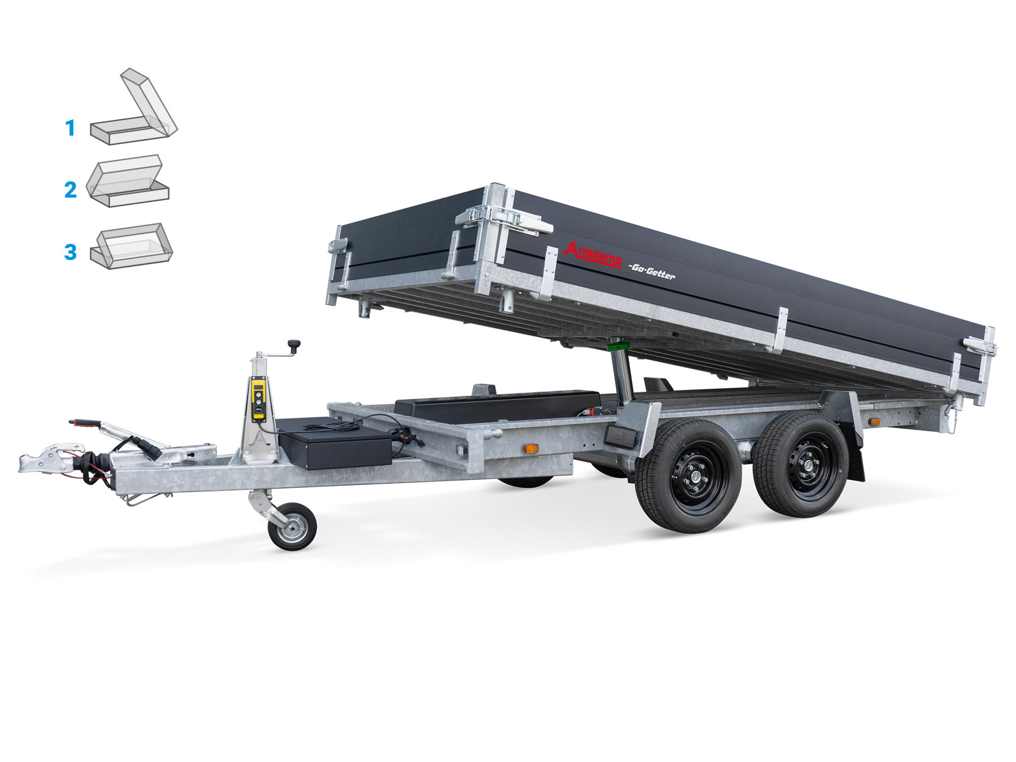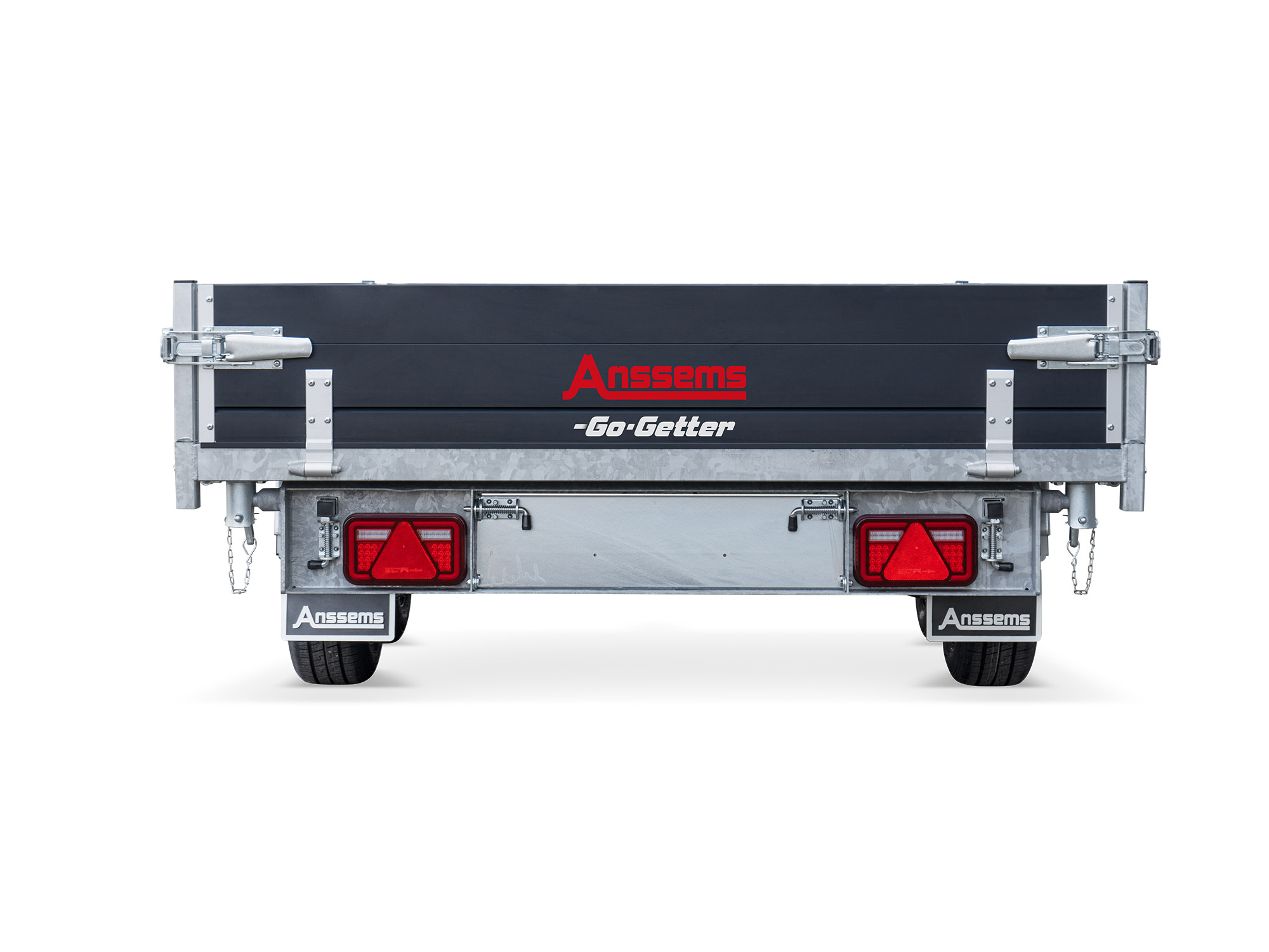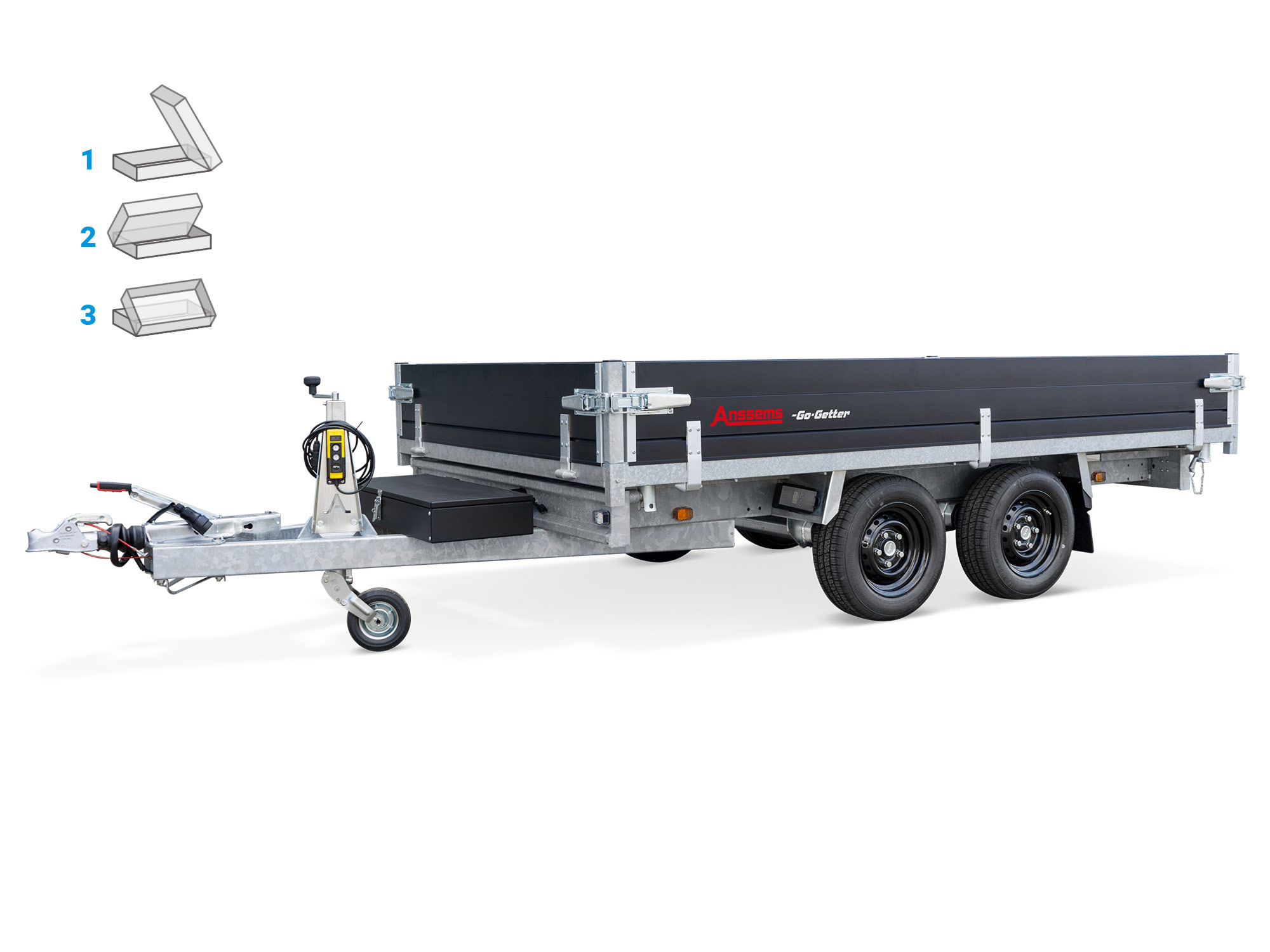 Der Anssems KSX 3000.305×178 E Go-Getter ist ein Dreiseitenkipper mit elektrischer Pumpe und hat viele Extras, wie schwarze Aluminiumwände, einen schwarzen Werkzeugkasten (40L), schwarze Stahlfelgen und ist hinzukommend komplett mit LED-Beleuchtung ausgestattet.