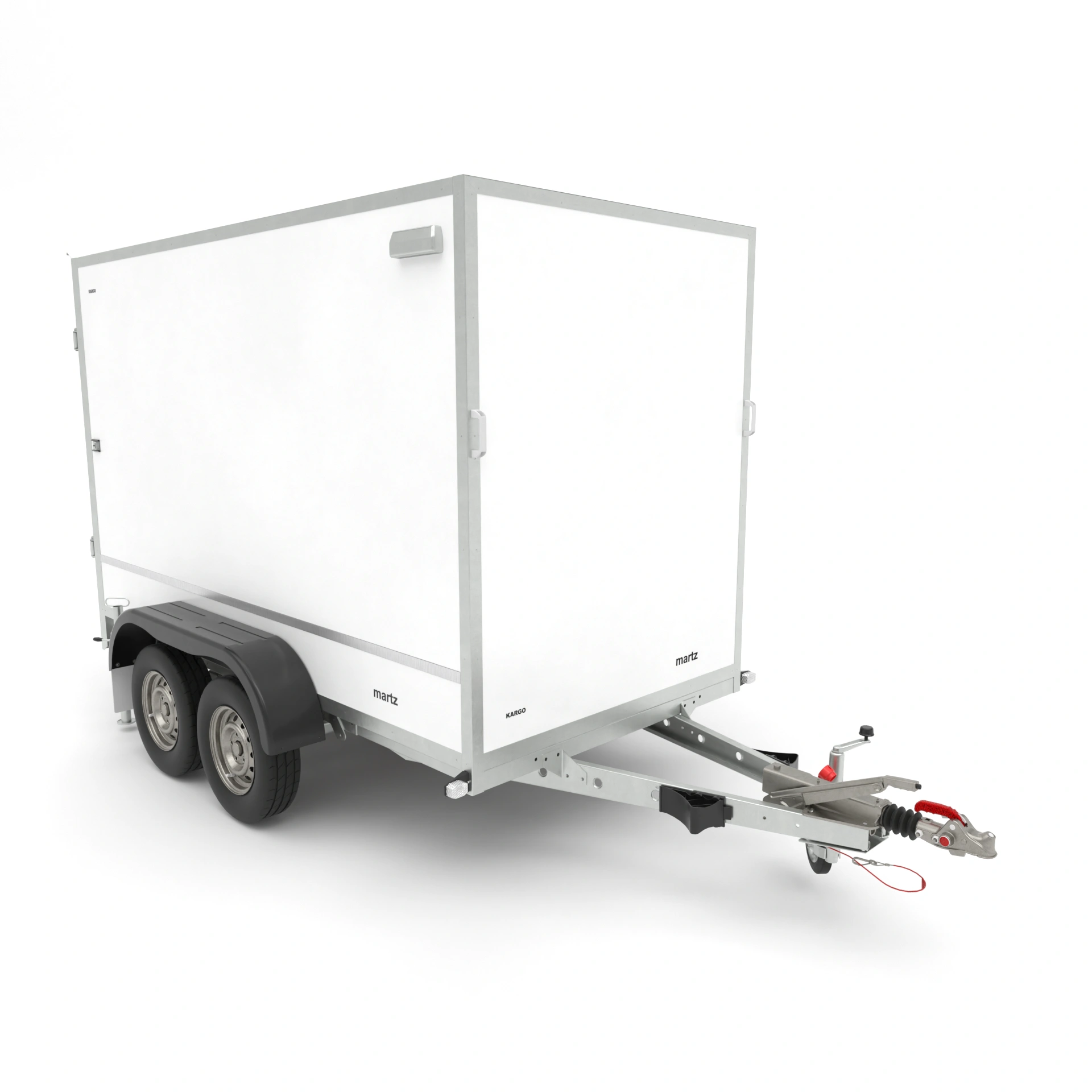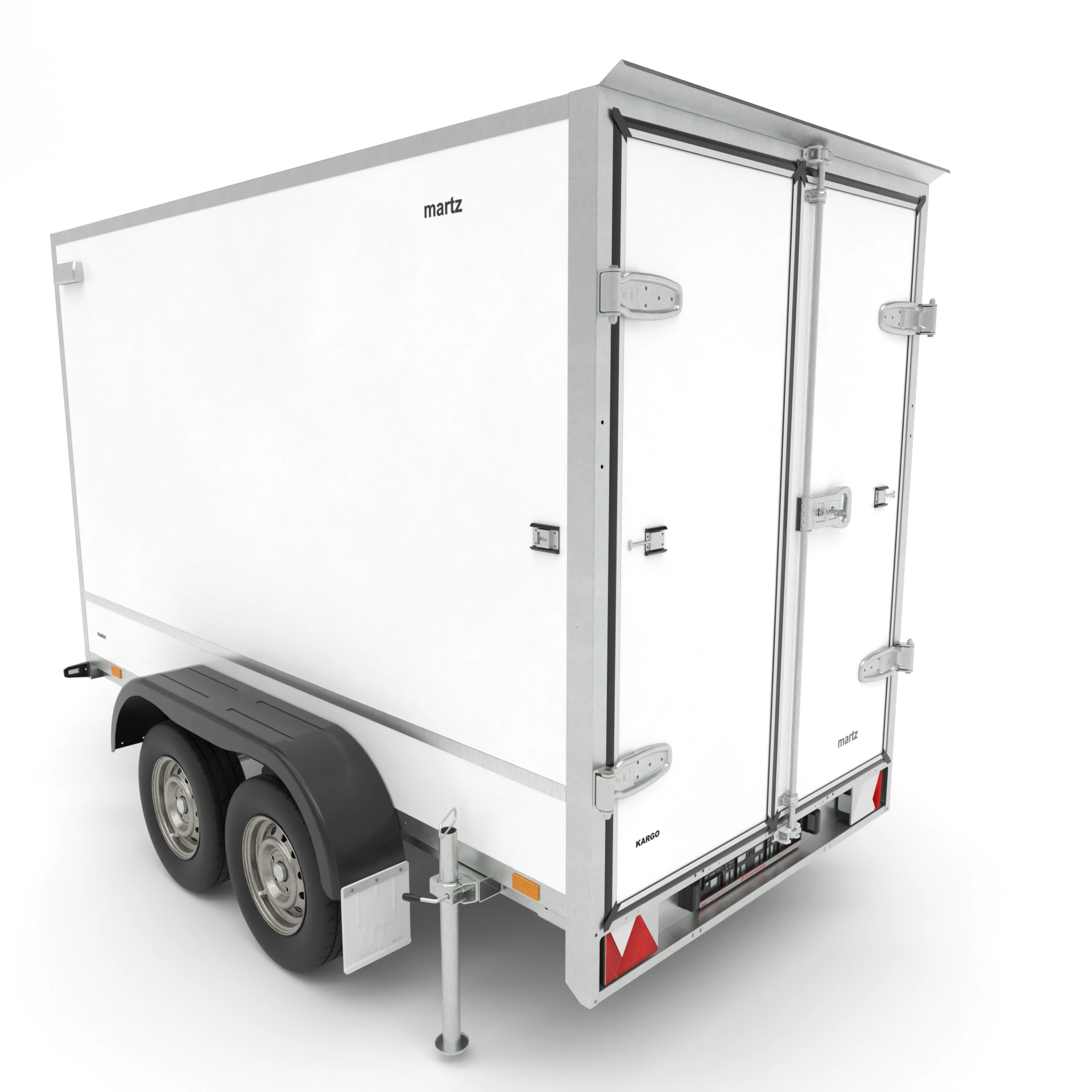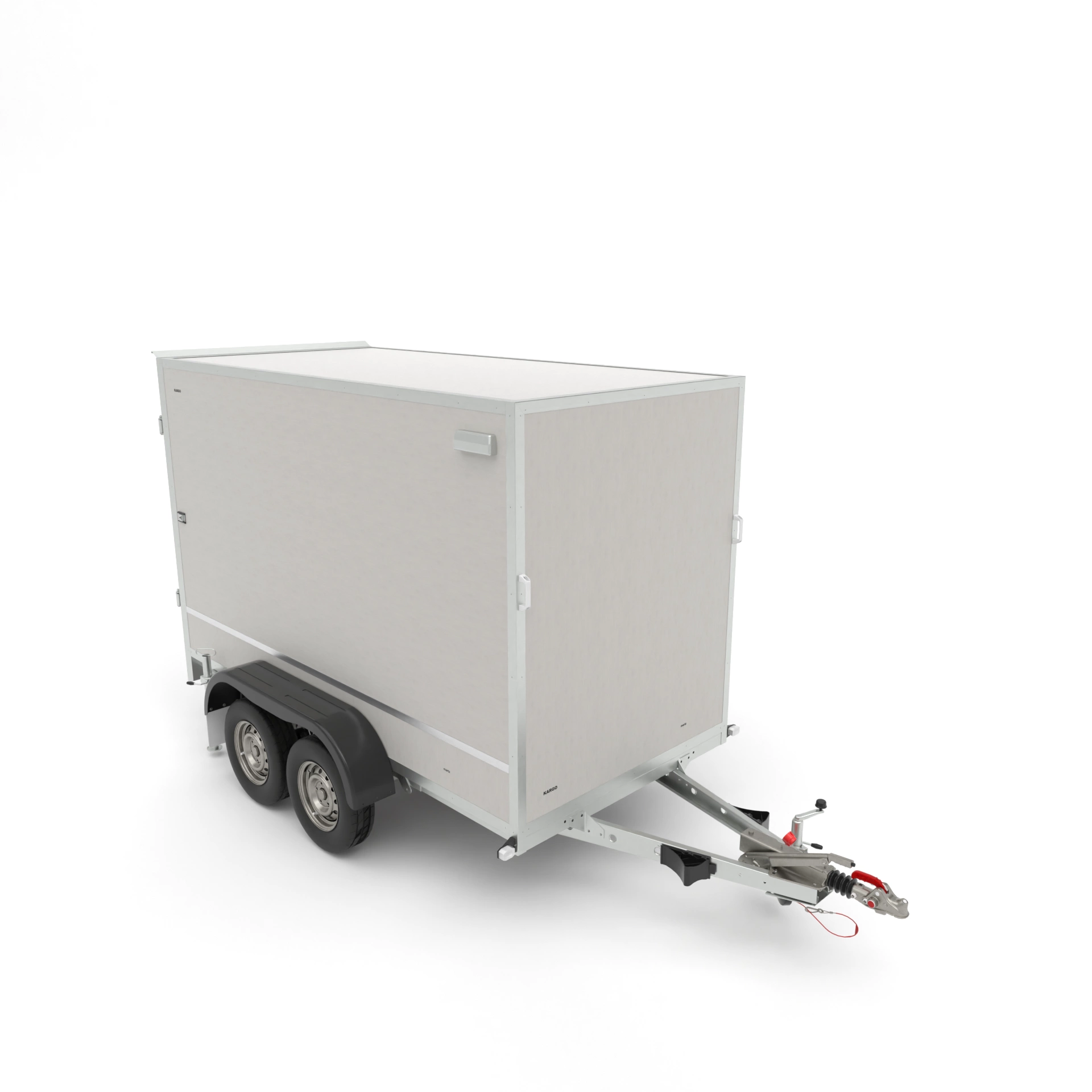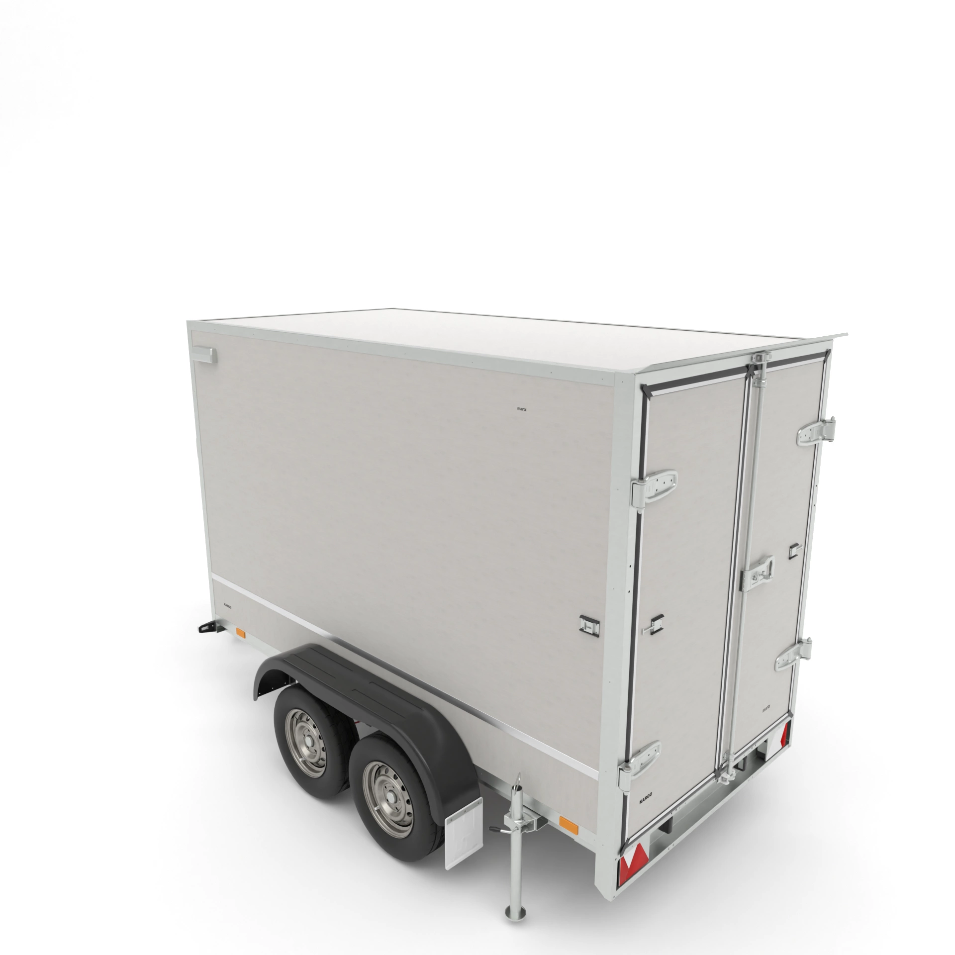 Eingebauter Anhänger für den Transport von Gütern, die einen besonderen Schutz von außen benötigen. Innen mit einem Blatt mit Löchern zur Sicherung der Ladung mit Förderbändern ausgestattet. Wasserdichte Innenwände aus wasserfestem Sperrholz, mit Silikon versiegelt. Doppelte Tür mit Schlüsselschloss als Standard. Möglichkeit, die Türen durch eine Auffahrrampe zu ersetzen.