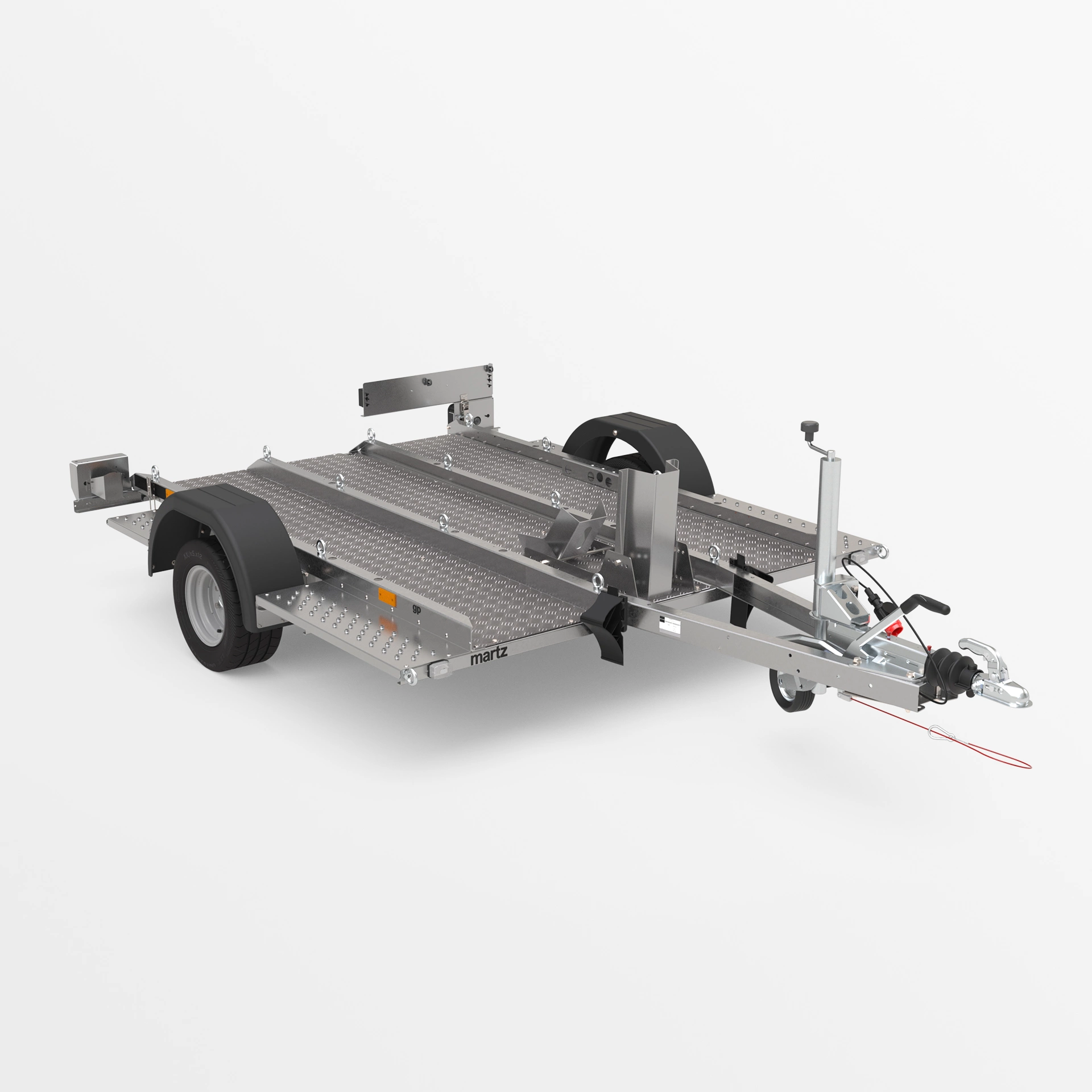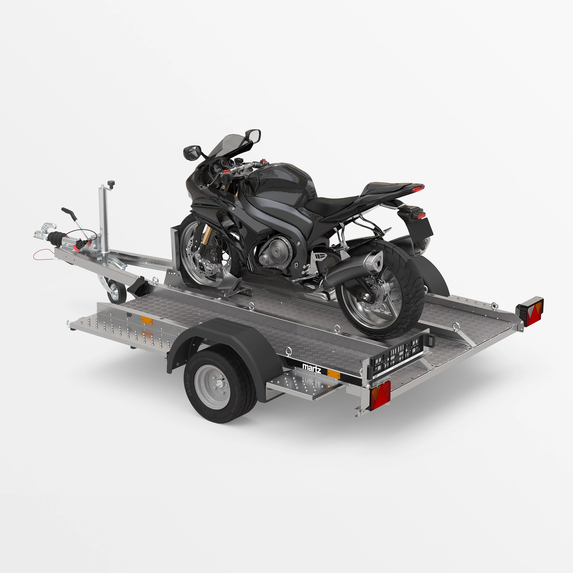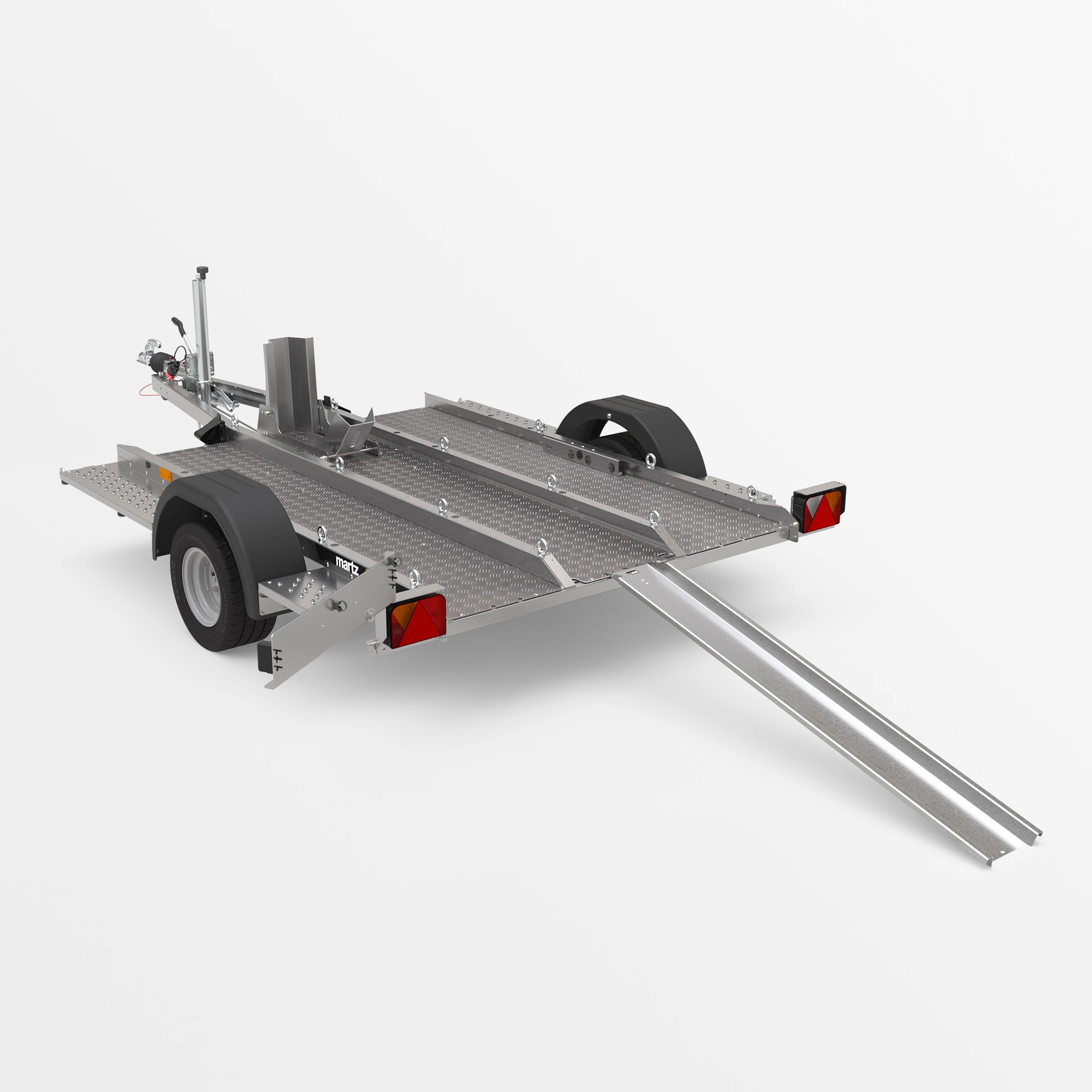 Anhänger mit geschweißter Rahmenkonstruktion, konzipiert für den Transport von Motorrädern und anderen einspurigen Fahrzeugen. Die Ladefläche aus Aluminium-Riffelblech ist mit zahlreichen Verzurrpunkten ausgestattet, die eine sichere Fixierung des Fahrzeugs während des Transports gewährleisten. Die abgesenkte Bauweise mit niedriger Ladekante ermöglicht ein einfaches und sicheres Auffahren mit dem Motorrad.
