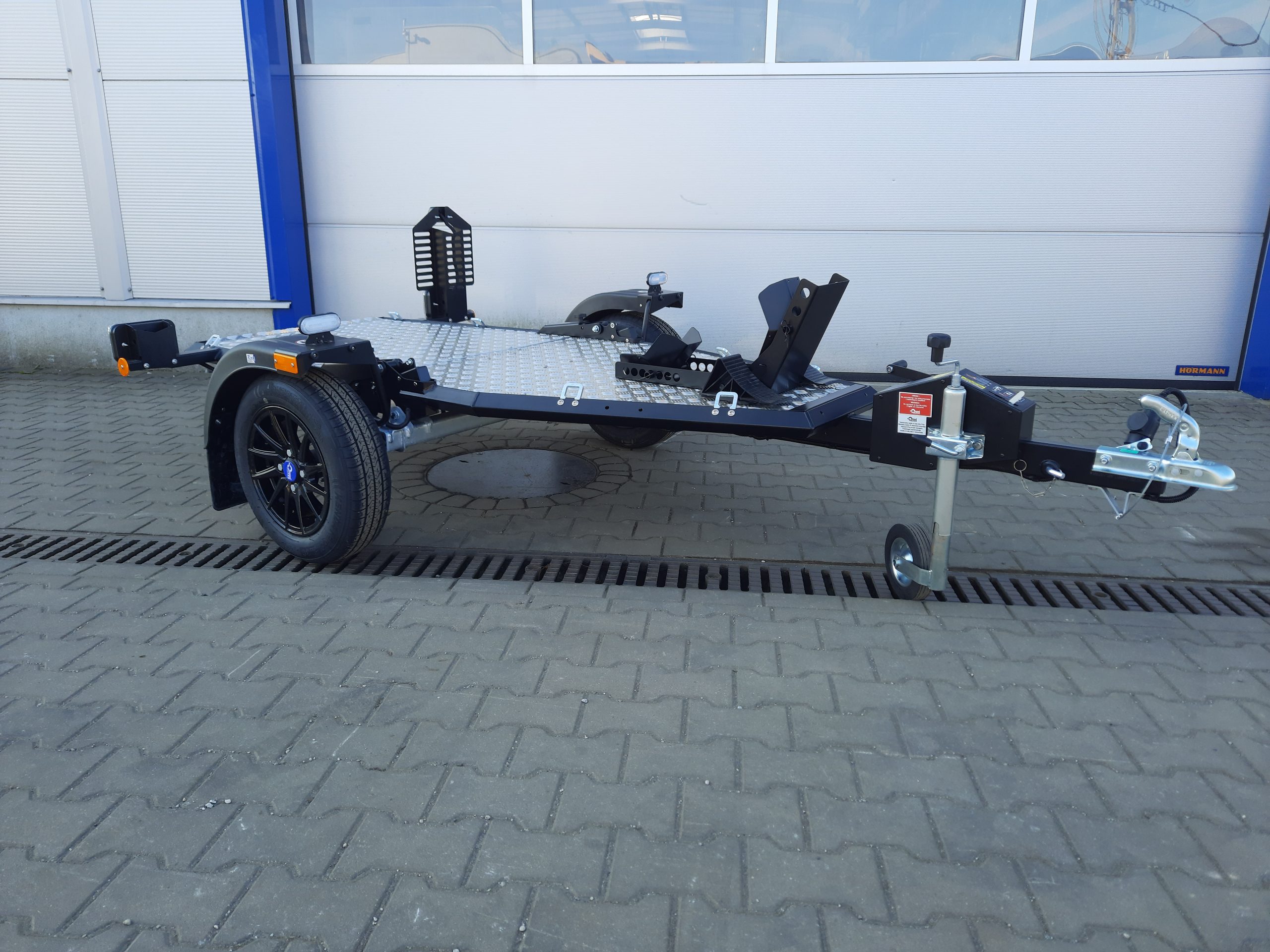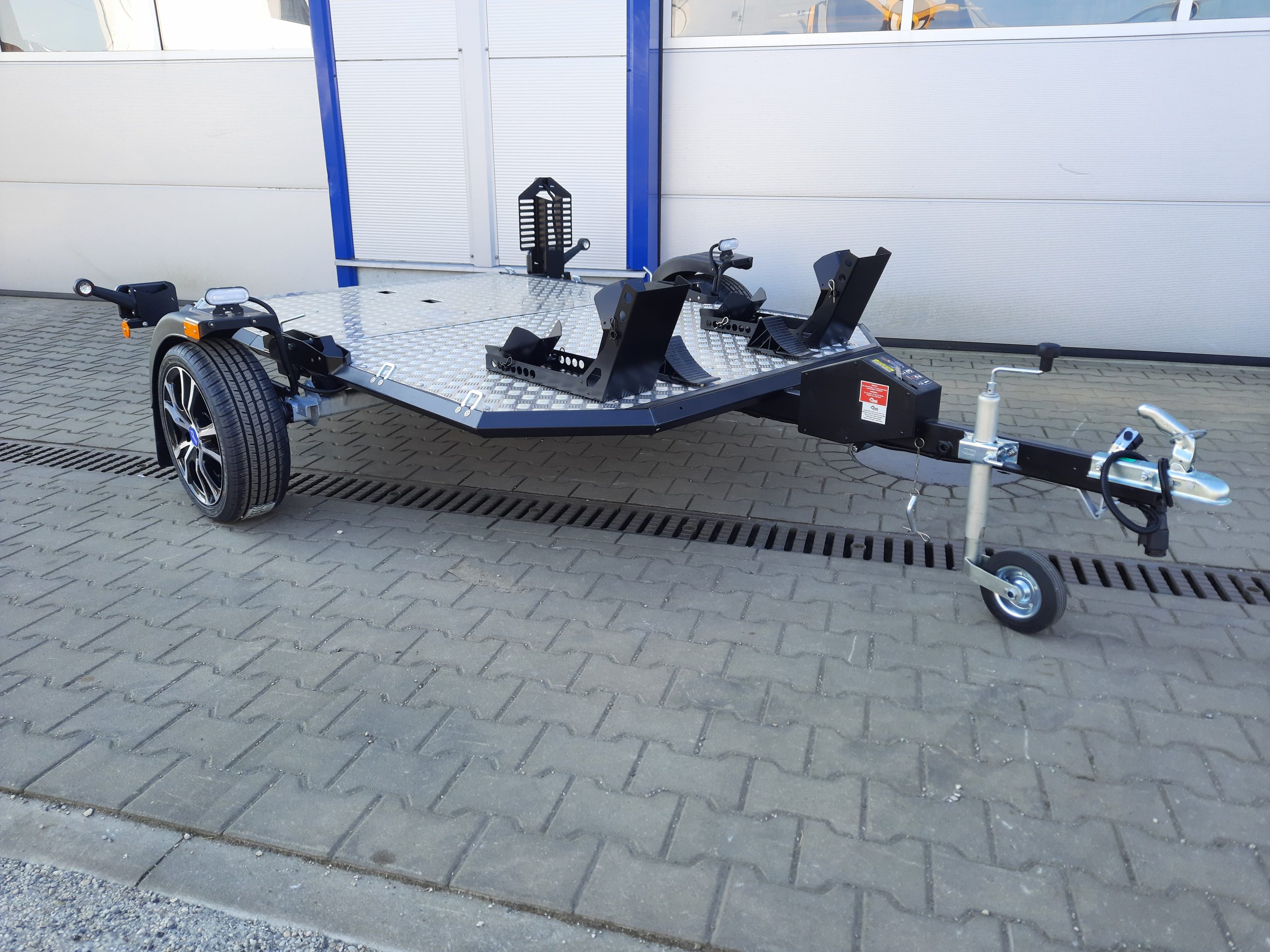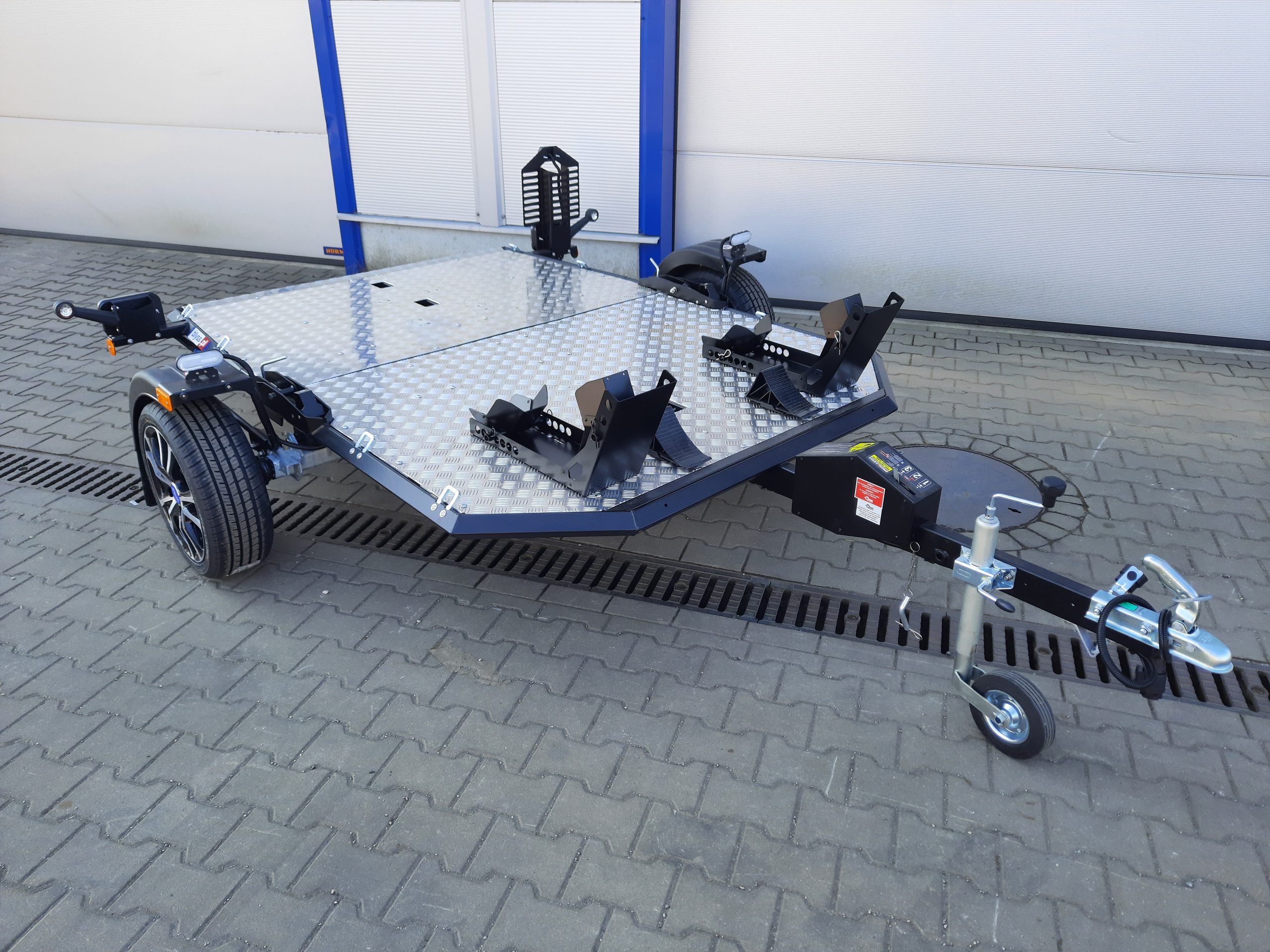 Die im Motorradanhänger eingesetzten technischen Lösungen werden durch ein weltweit geltendes Patent geschützt. Der Anhänger für zwei Motorräder ist serienmäßig mit einem Stützrad und LED-Beleuchtung ausgestattet.Der Boden des Anhängers ist mit gewellten Aluminiumblechen und zahlreichen Halterungen für Transportgurte ausgekleidet.