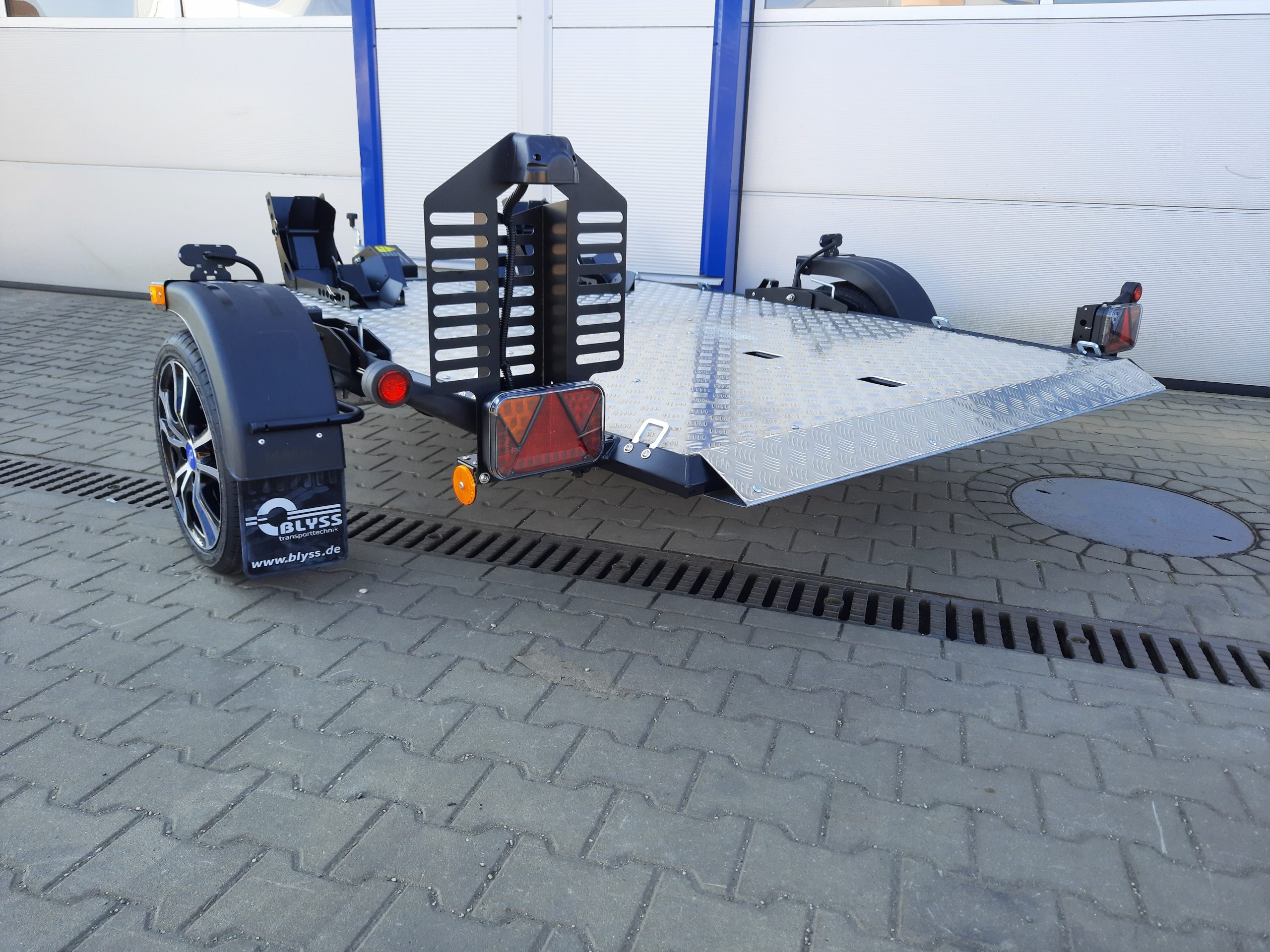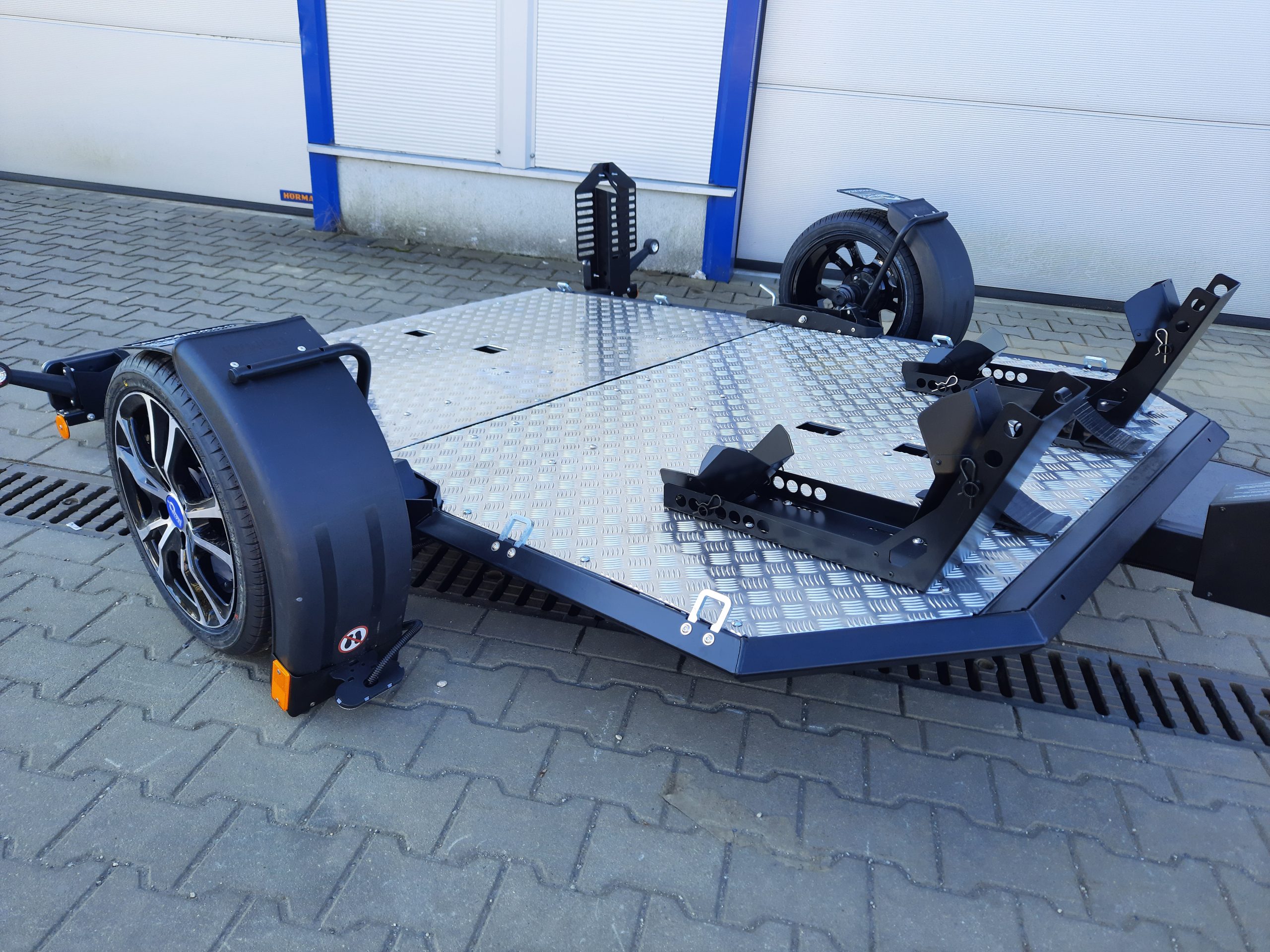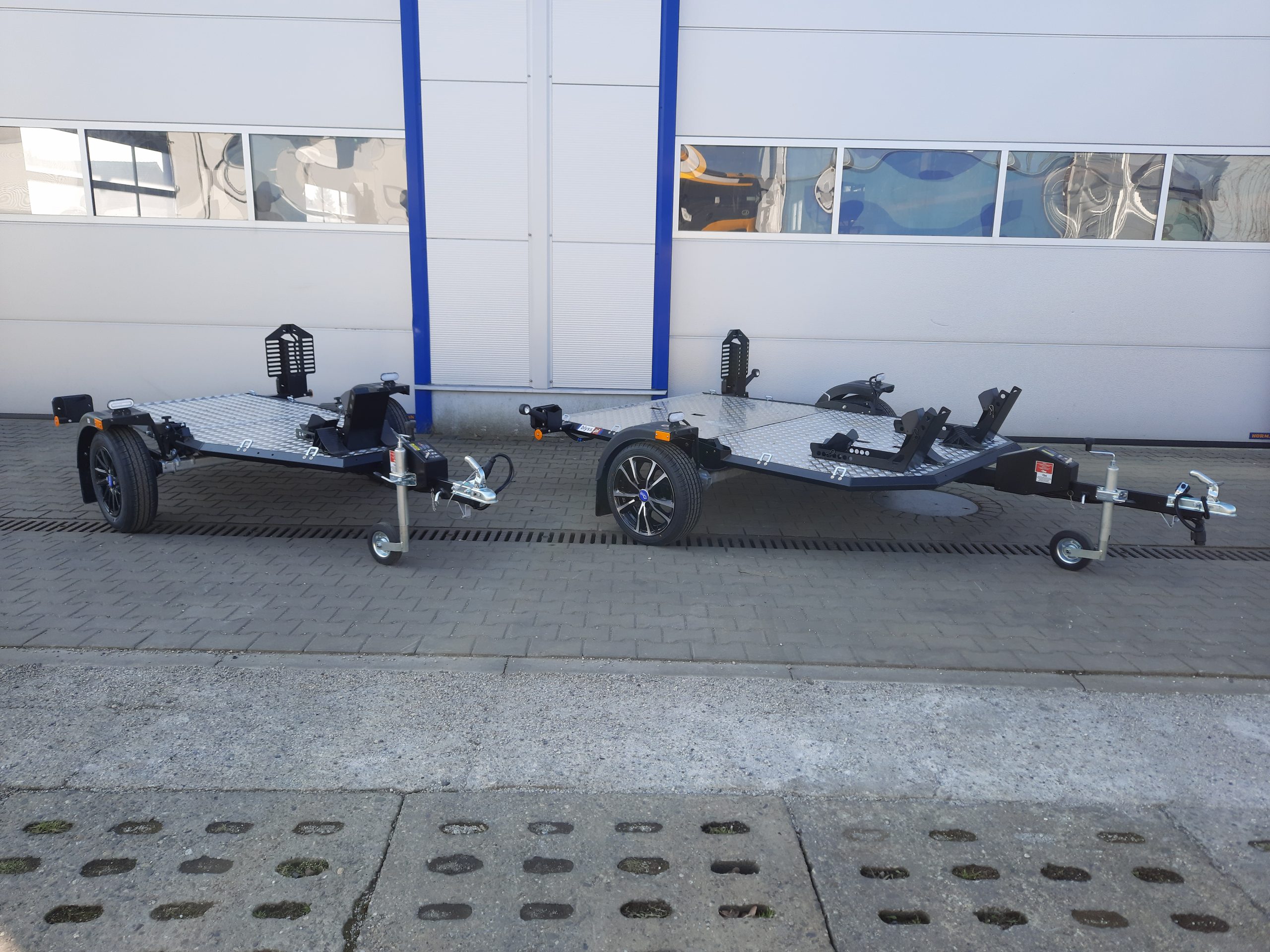 Die im Motorradanhänger eingesetzten technischen Lösungen werden durch ein weltweit geltendes Patent geschützt. Der Anhänger für zwei Motorräder ist serienmäßig mit einem Stützrad und LED-Beleuchtung ausgestattet.Der Boden des Anhängers ist mit gewellten Aluminiumblechen und zahlreichen Halterungen für Transportgurte ausgekleidet.