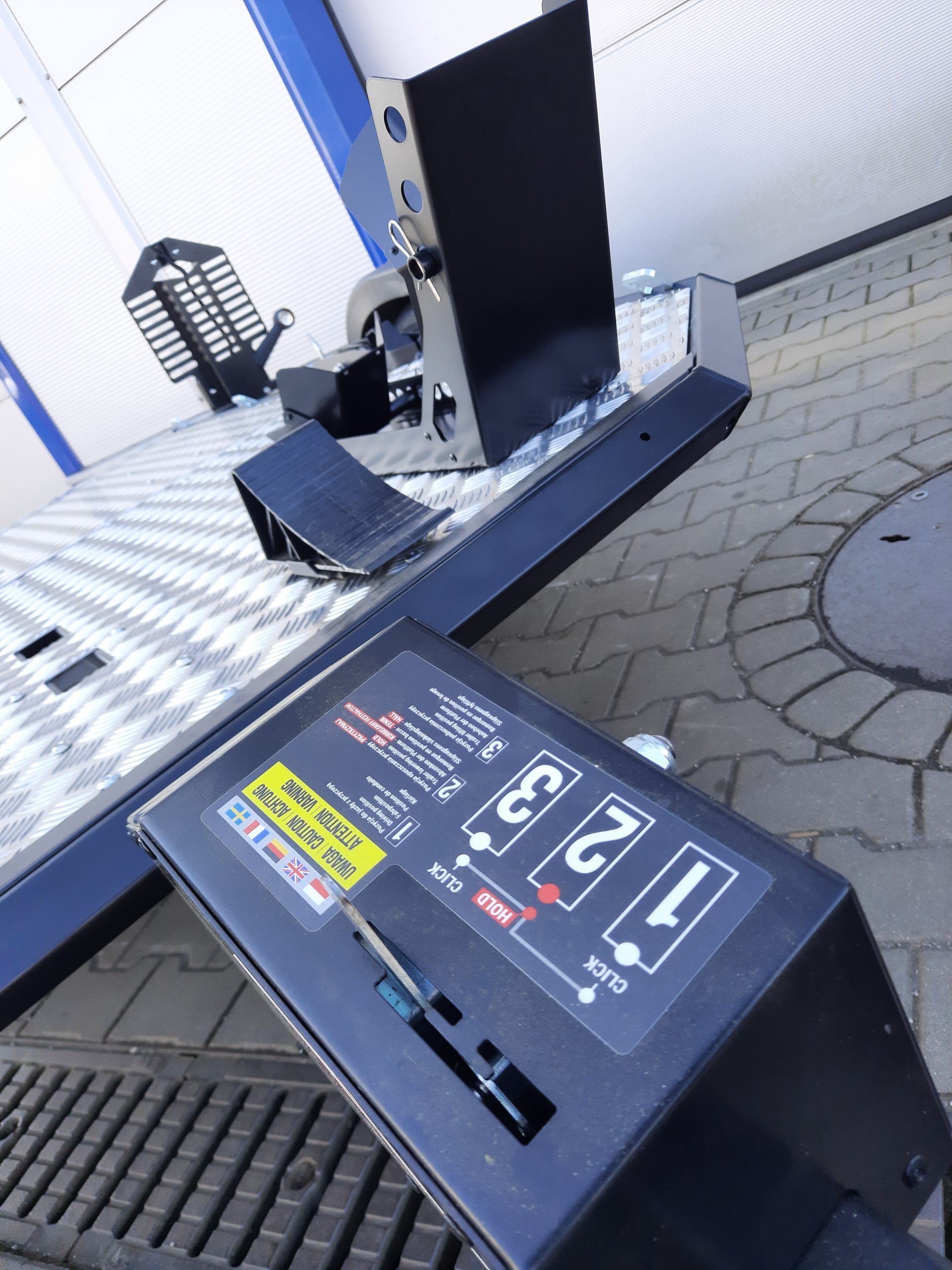 Der Motorradanhänger für zwei Fahrzeuge ist mit einem bequem zu bedienenden Mechanismus zum Anheben und Absenken der Plattform ausgestattet. So lassen sich die Motorräder leicht in den Anhänger hinein- oder herausfahren.