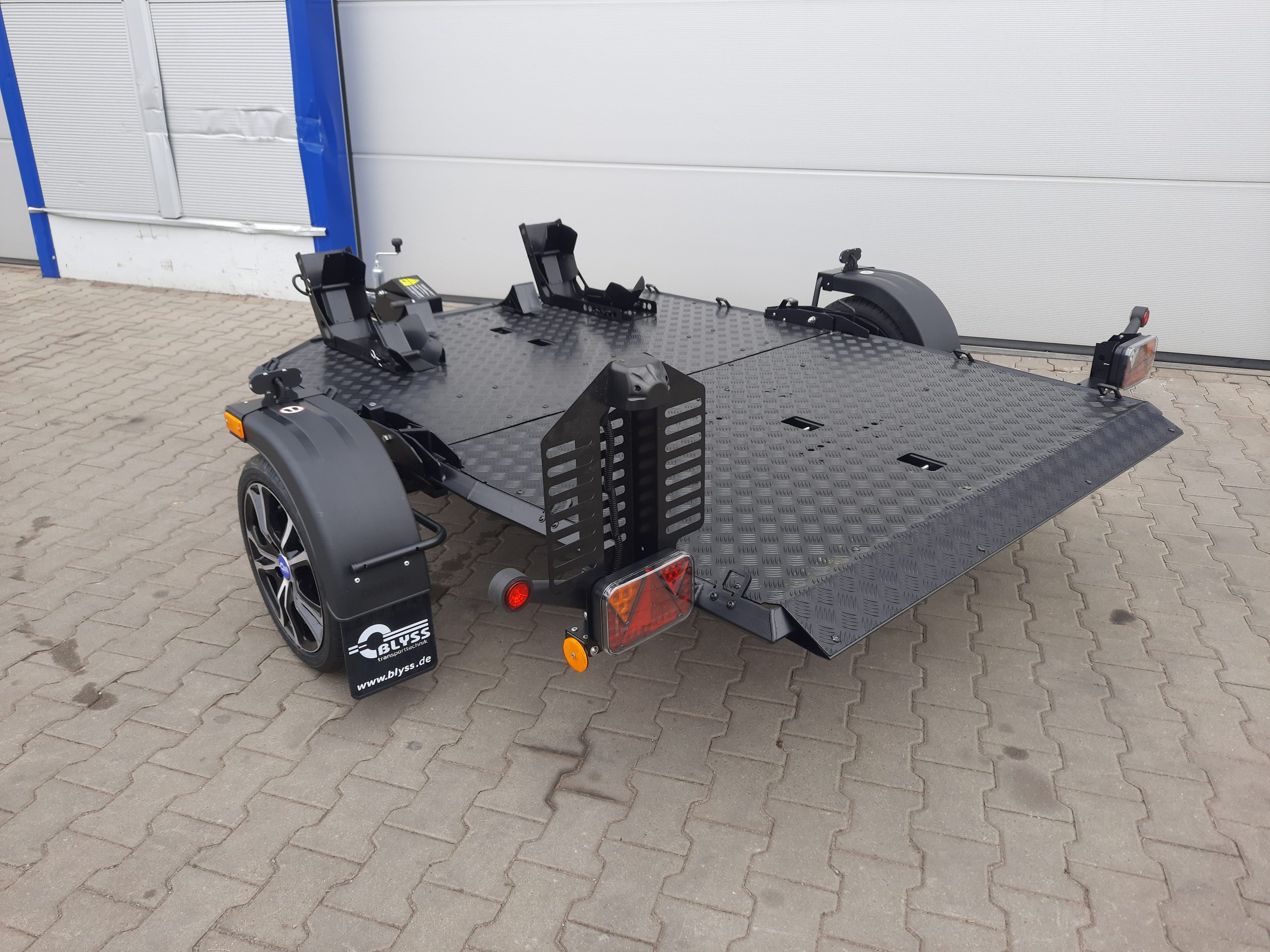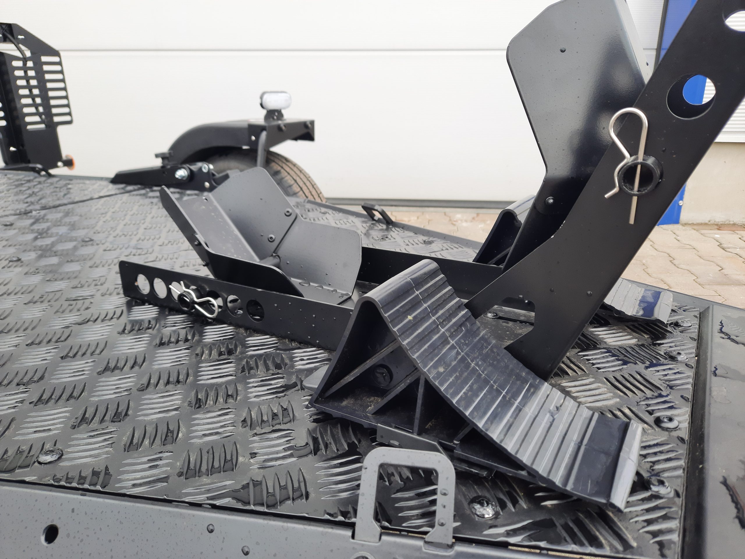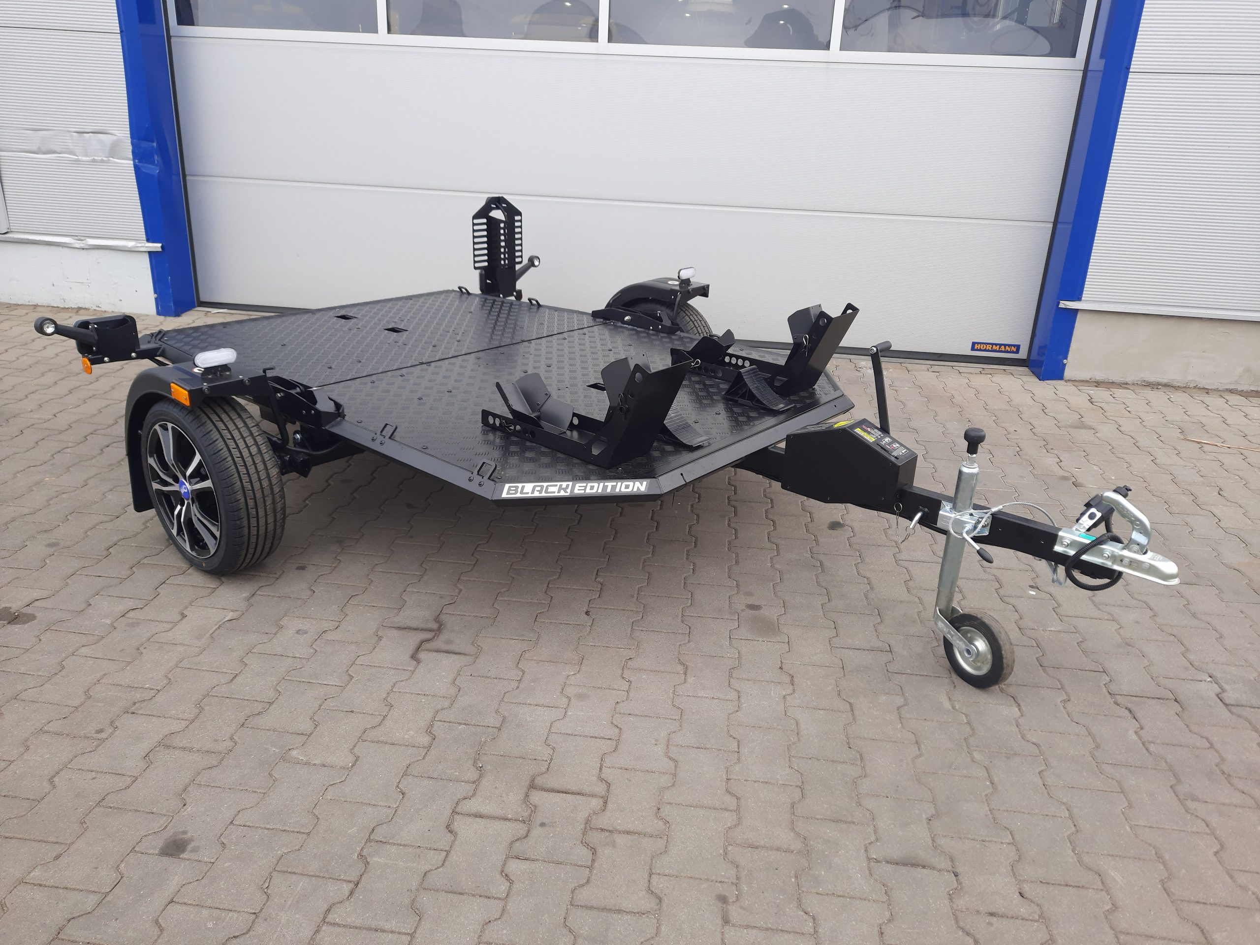 Anhänger für zwei Motorräder in Standard hat Aluminiumfelgen, jockey wheel Und LED-Beleuchtung und ist mit schwarzem Lack überzogen. Boden Der Anhänger ist ausgekleidet gewelltes Aluminiumblech und zahlreiche Halterungen für Transportgurte (4 auf jeder Seite und in der Mitte der Plattform).