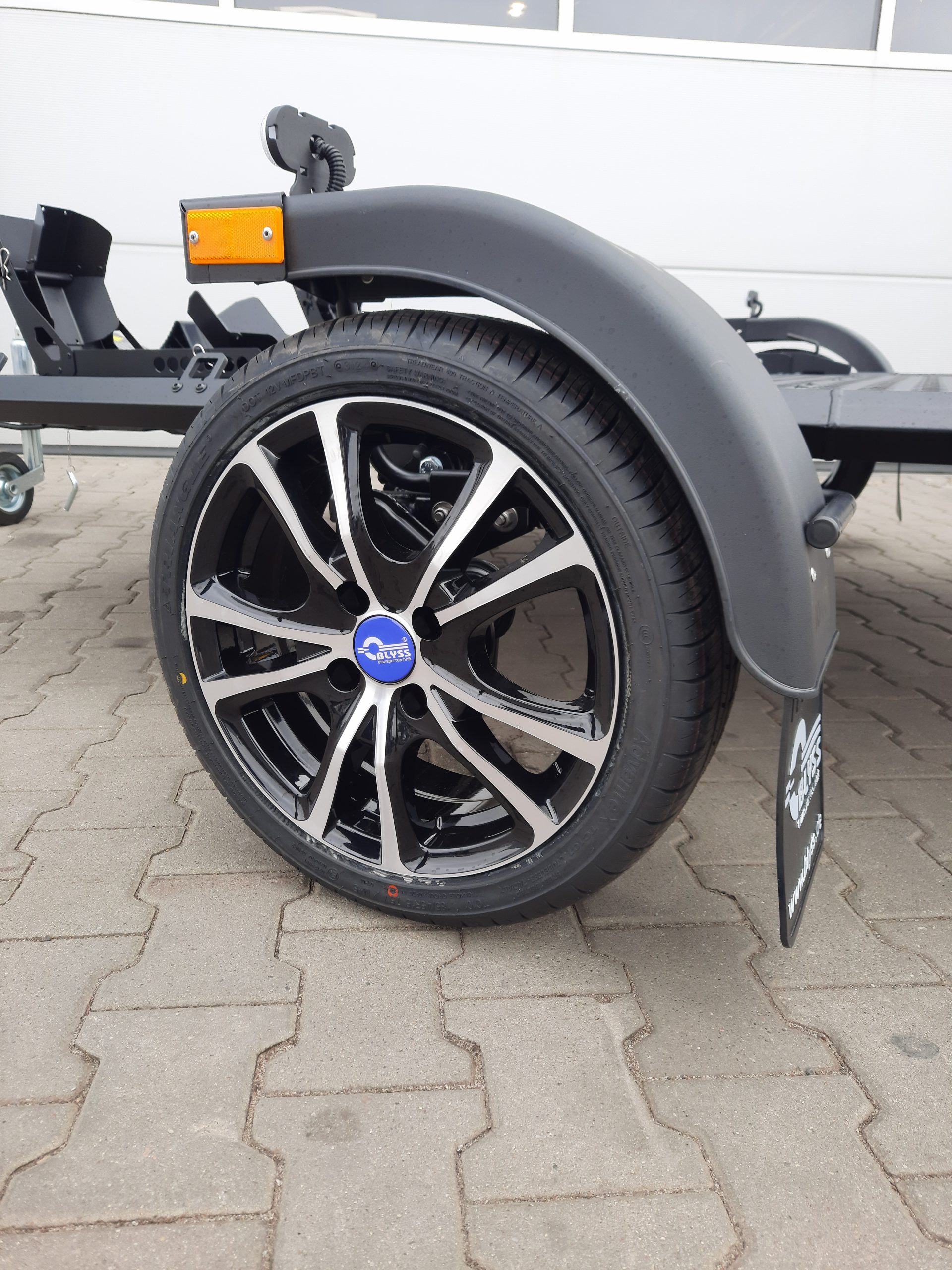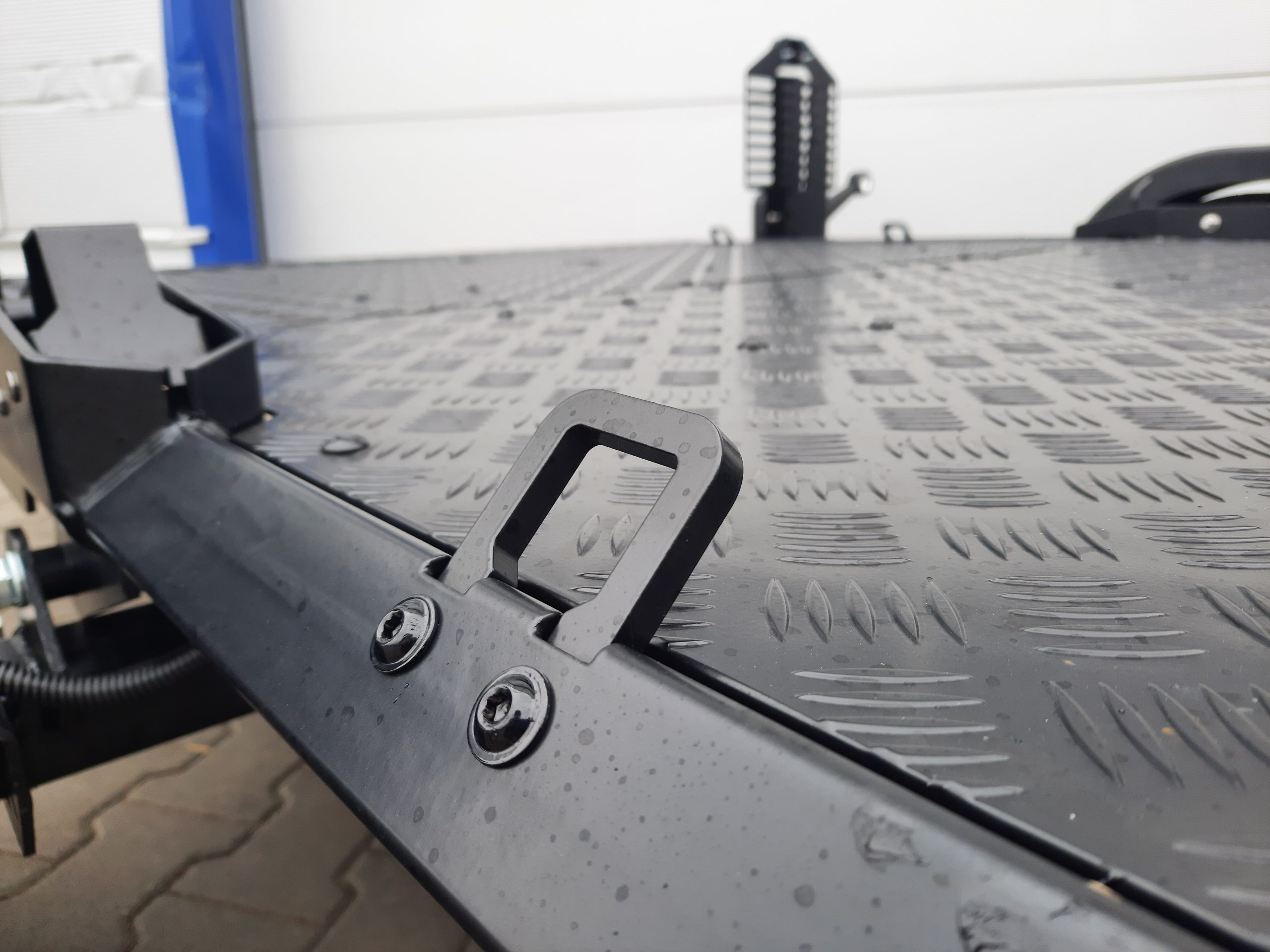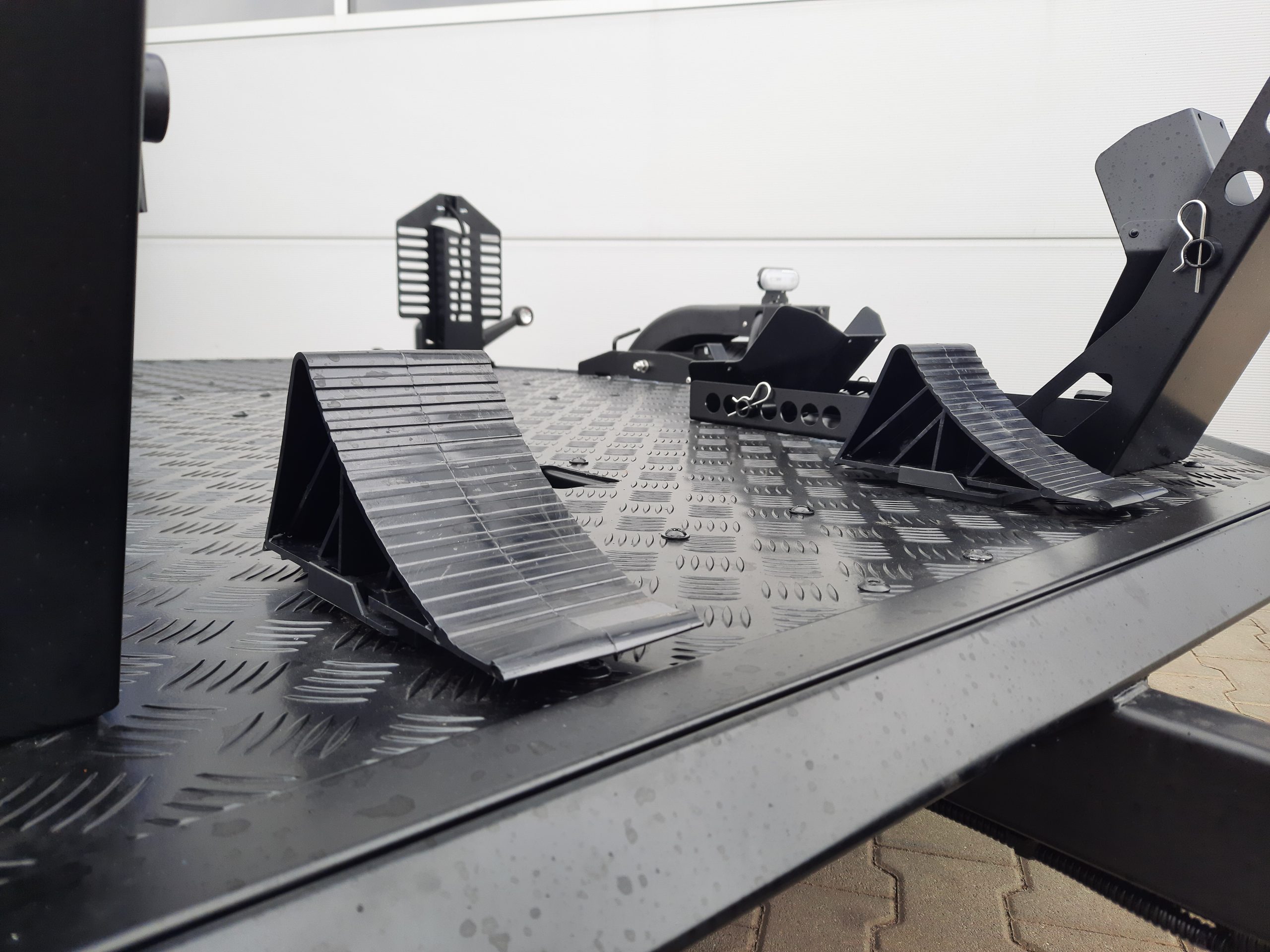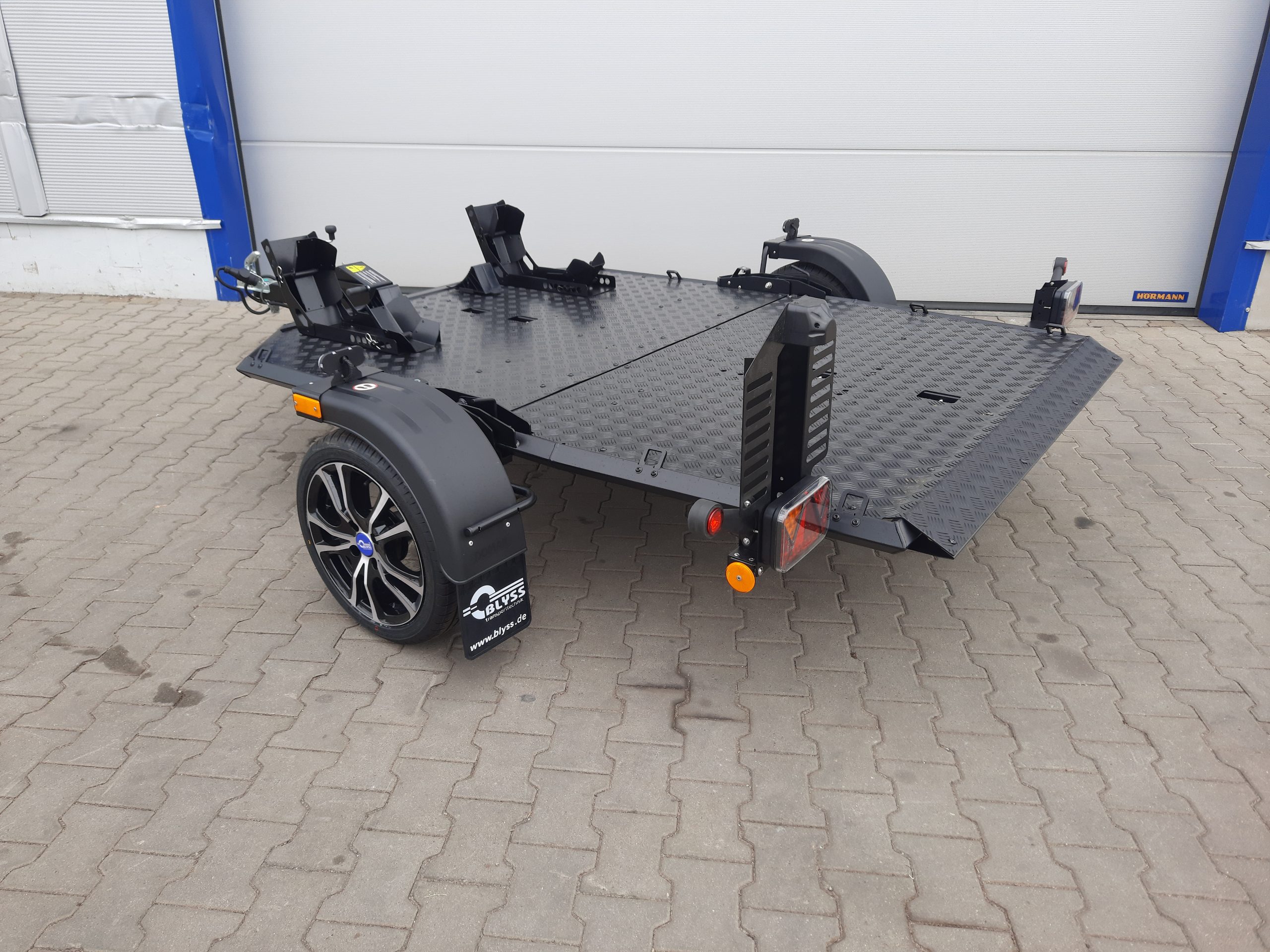 Anhänger für zwei Motorräder in Standard hat Aluminiumfelgen, jockey wheel Und LED-Beleuchtung und ist mit schwarzem Lack überzogen. Boden Der Anhänger ist ausgekleidet gewelltes Aluminiumblech und zahlreiche Halterungen für Transportgurte (4 auf jeder Seite und in der Mitte der Plattform).