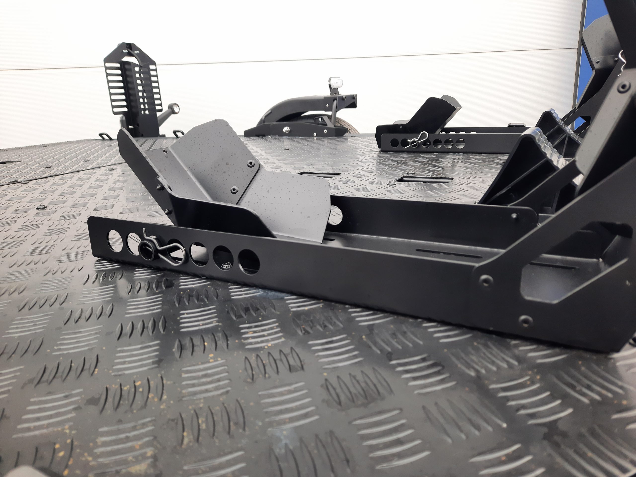 Der Anhänger kann zusätzlich ausgestattet werden mit Ersatzrad, Diebstahlschutz Und Verkleidung oder Geländer zur Begrenzung der Einfahrt. Durch den Einsatz der Frontschiene wird der MT-2 zum Anhänger zum Transport von Quads.