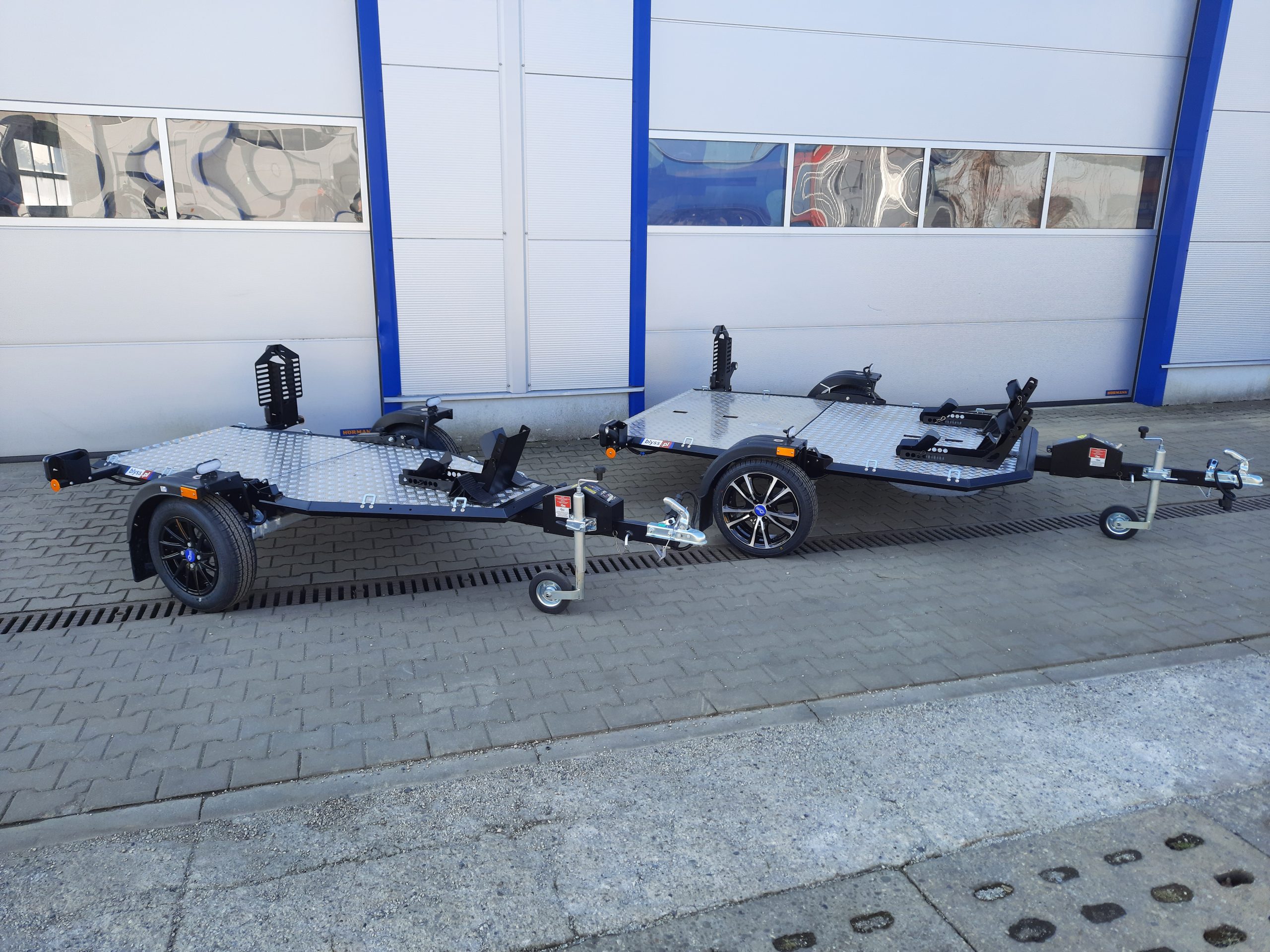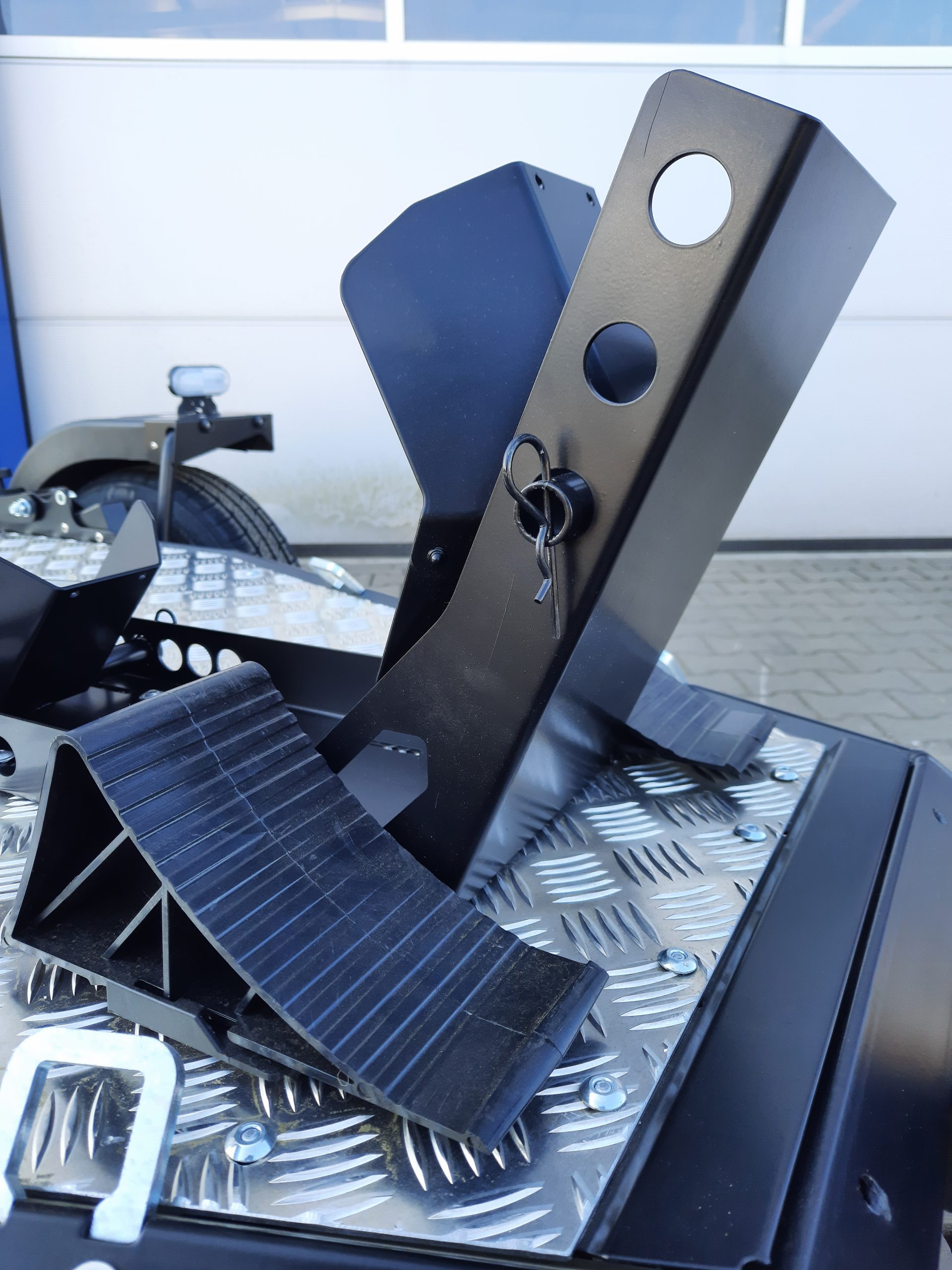Ein spezieller einachsiger Anhänger für den Transport von Motorrädern mit einem zulässigen Gesamtgewicht von bis zu 750 kg ist ein ideales Transportmittel für Zweiräder. Seine Struktur basiert auf einem stabilen Rahmen, der zusätzlich von Querverstärkungen getragen wird, an die eine Deichsel geschweißt ist.