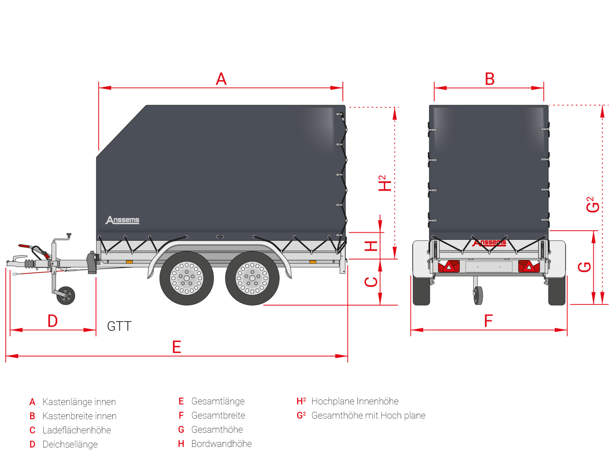Der Anssems GTT Kastenanhänger, komplett mit Aerodynamische Hochplane (Höhe 180 cm), besteht aus einer stabilen Aluminiumkonstruktion und hat ein modernes Design. Er verfügt über ein niedriges Leergewicht, 30 cm hohe Alubordwände, 8 Bindeösen an der Außenseite, Stützrad und rutschfesten Holzboden. Das Planengestell ist sehr stabil und robust durch vernietetem Vierkantstahlrohraufbau. Die Hochplane besteht aus einem hochwertigen Qualitäts-Planentuch (LKW-Qualität) und verfügt über eine Windschräge. Diese bietet einen großen Vorteil im Hinblick auf die Aerodynamik und der Kraftstoffreduzierung. Elektrischer Anschluss: 13-poliger Stecker. *Das Leergewicht ist ohne Zubehör.