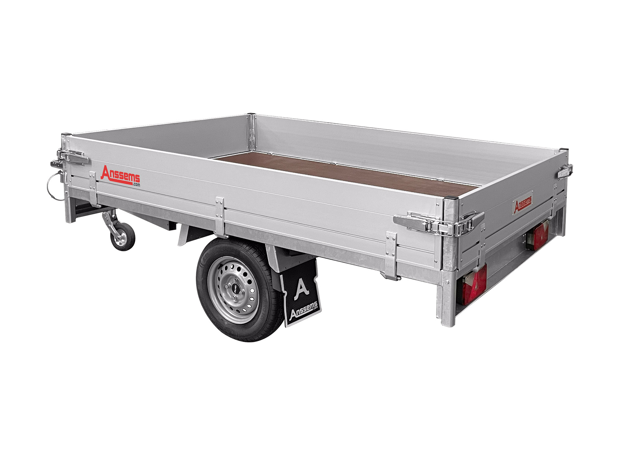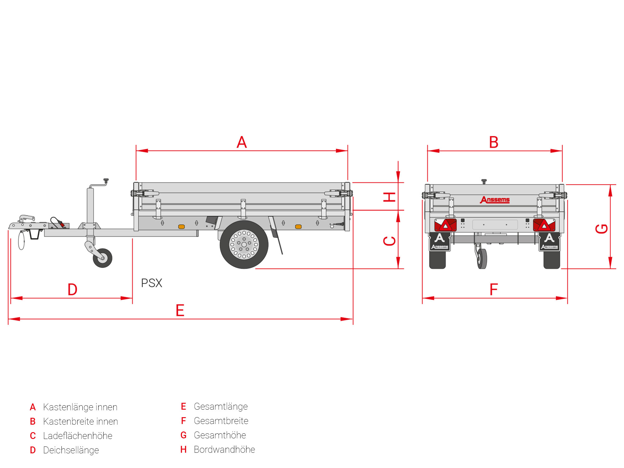 Anssems PSX Hochlader mit stabilem, verschweißten Rahmen, serienmäßig ausgestattet mit 30 cm hohen Alubordwänden welche sich beim Herunterklappen unter dem Boden befinden, herausnehmbaren Eckrungen, Ausziehrohren zur Ablage von Hinterbordwand, Seitenbeleuchtung, 8 Bindehaken im Boden, 8 Bindeösen außen am Rahmen, Automatikstützrad und rutschfestem Holzboden. Elektrischer Anschluss: 13-poliger Stecker.